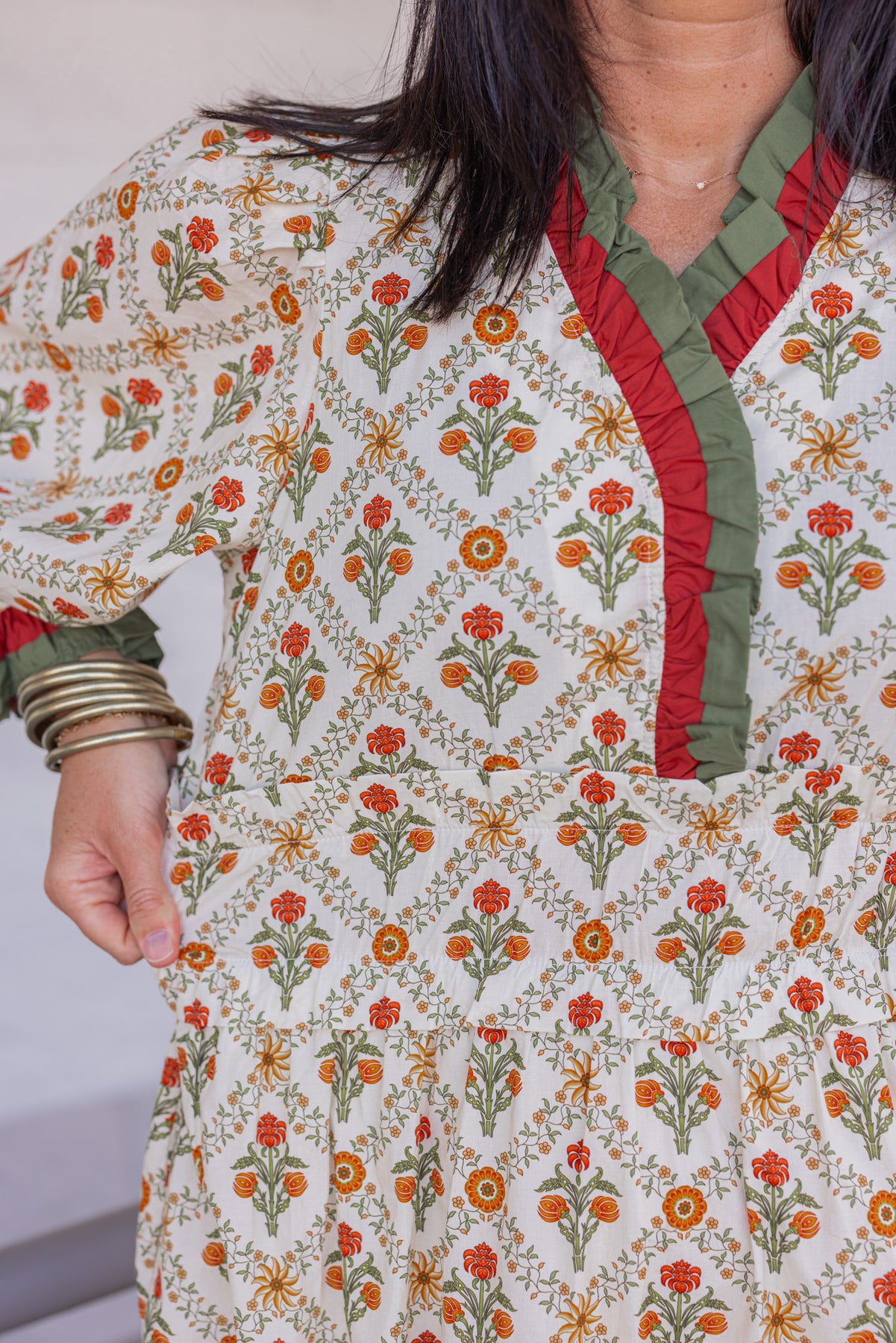 Bring the colors of Autumn to your wardrobe with this playful ecru midi dress, adorned with sassy orange and green floral print. The V neckline is framed by charming olive and brick red ruffle trim, adding a flirty touch. A ruffle trimmed elastic waistband ensures a comfy, flattering fit, while the ruffled bottom hem dances with every step. Perfect for days when you want to feel effortlessly fun and stylish!