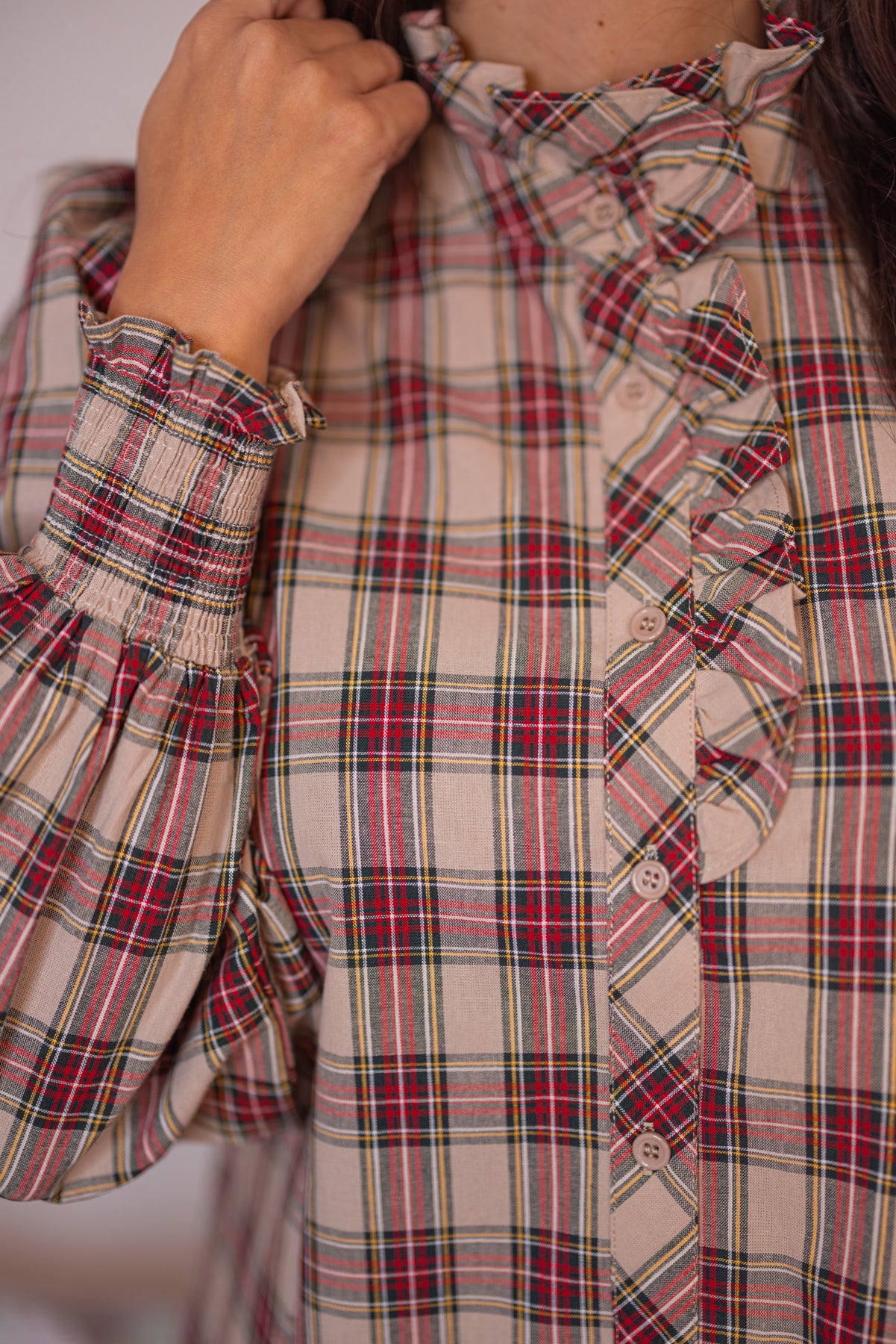 Embrace vintage charm with this taupe plaid button front top featuring playful red and green print! The ruffle details around the mock neck and down the bodice add a flirty touch, while the smocked cuffs and long balloon sleeves offer a fun, comfy fit. Perfect for adding a unique twist to any outfit!