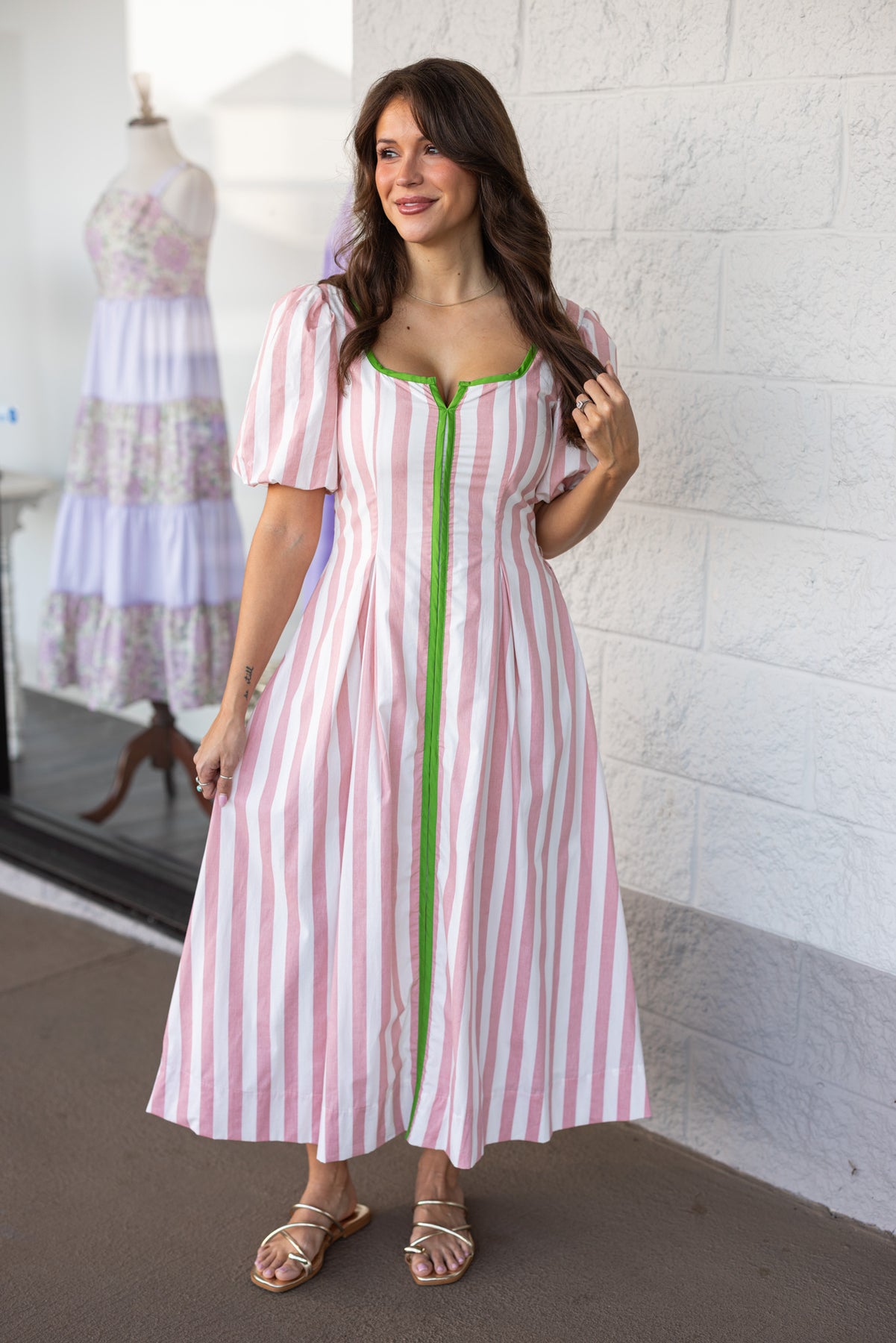 This breezy, beautiful midi dress features light pink and white stripes with green piping trim for a fun twist on a classic silhouette. Designed with puff sleeves, a flattering gathered waistline, and hidden back zipper closure it's perfect for all of your upcoming Spring and Summer events - from Easter to cruise vacations!