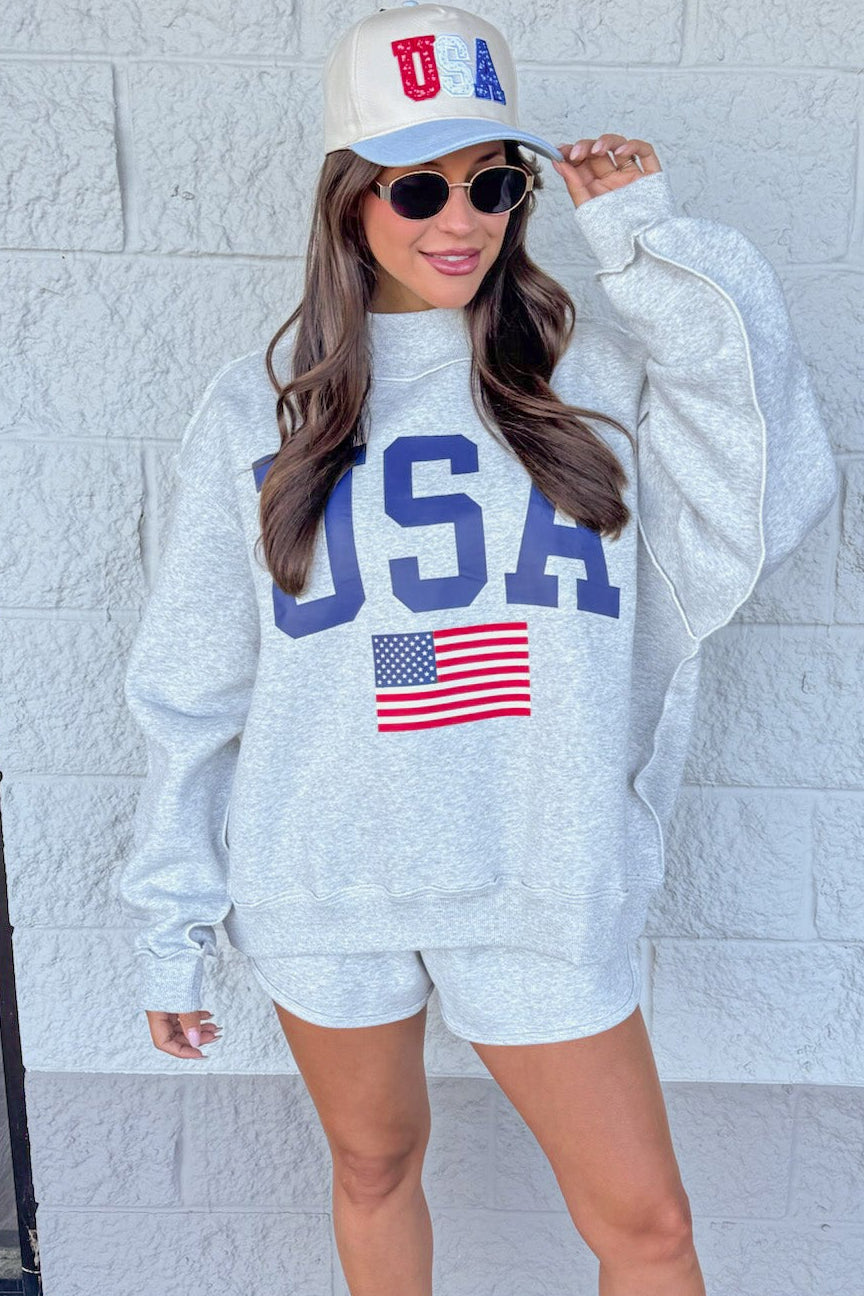 Show your patriotic spirit in this charming sweatshirt! Crafted from soft French terry knit and reversible fleece knit - with "USA" and an American flag on one side, and "AMERICA" on the other. Featuring a comfy mock neck, cuffed long balloon sleeves, and a banded bottom hem, all in a perfect oversized fit. Pair with our matching shorts for the cutest outfit!