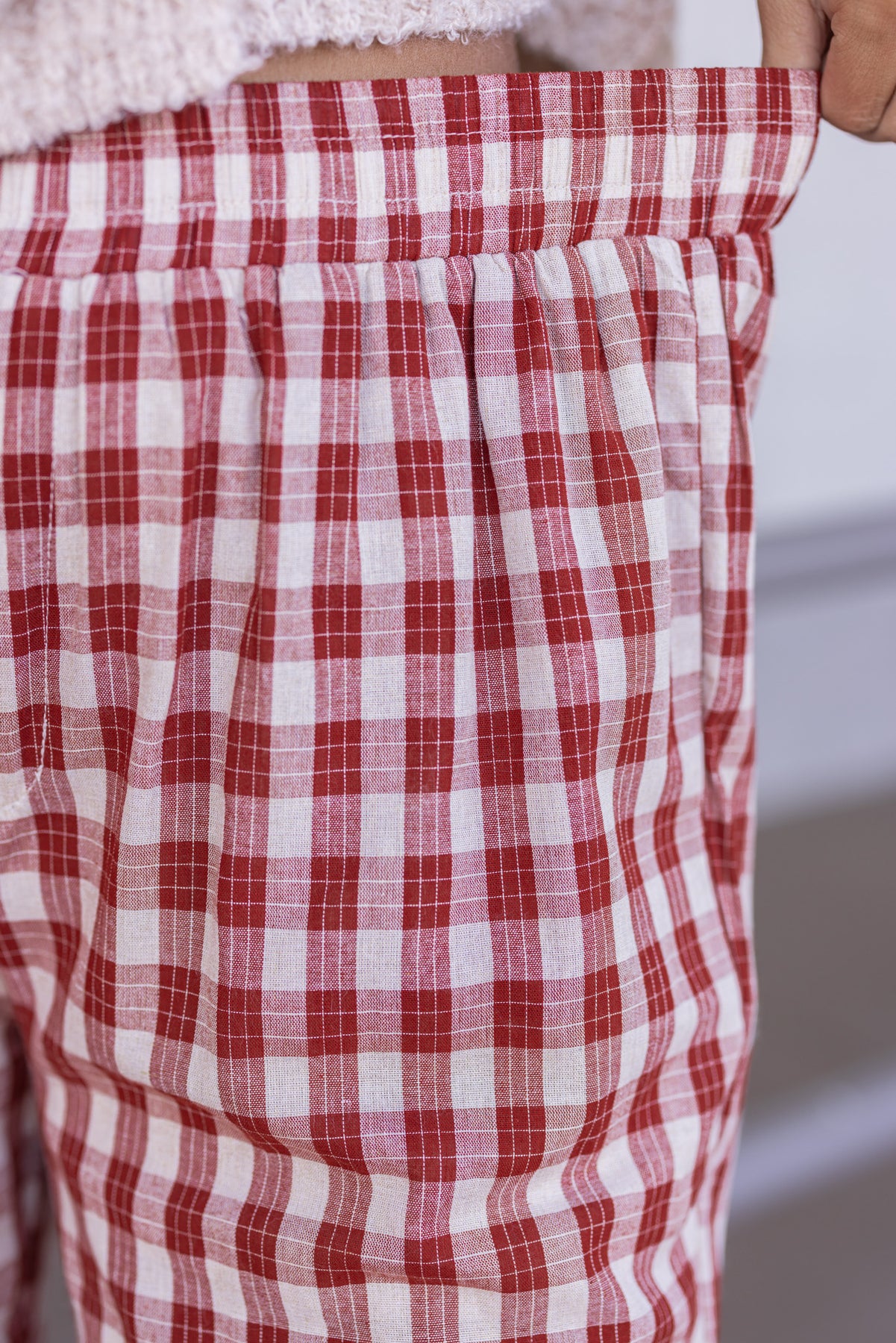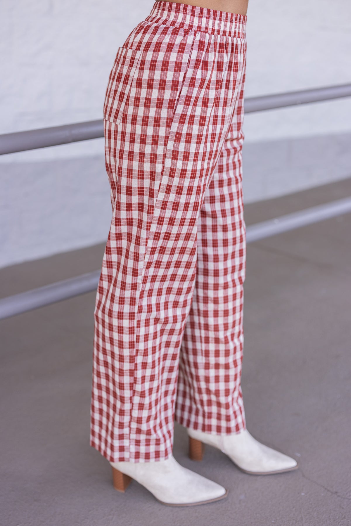 Women's rust and taupe plaid wide leg pants by Wishlist showing elastic waistband