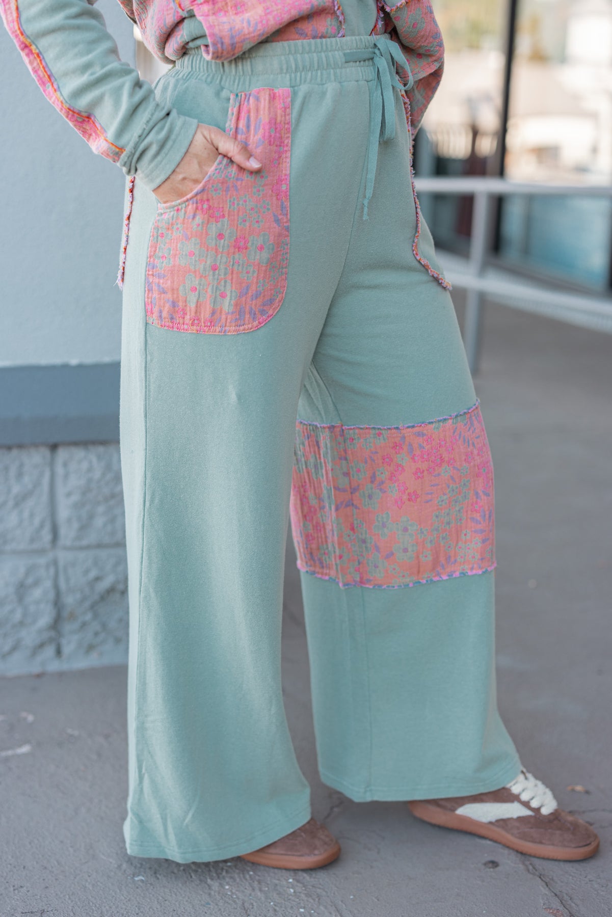 Embrace cozy charm with these sage green French terry knit pants, featuring playful frayed floral gauze patches in pink, lavender, peach, and mint. The drawstring elastic waistband adds a classic touch, while the wide legs bring a fun, whimsical vibe. Perfect for adding a splash of color and comfort to your everyday look! Pair with matching top for a trendy but super comfy outfit!