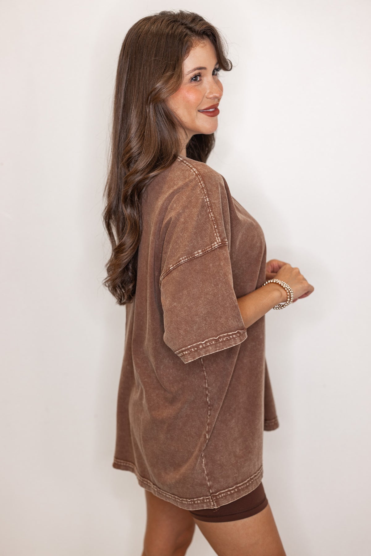 We LOVE an oversized tee! This cute babe is mineral washed brown, and features a ribbed crew neckline, reverse seam details, and missing front chest pocket. So cute for a day out, or just lounging at home. She's definitely a PD fav!