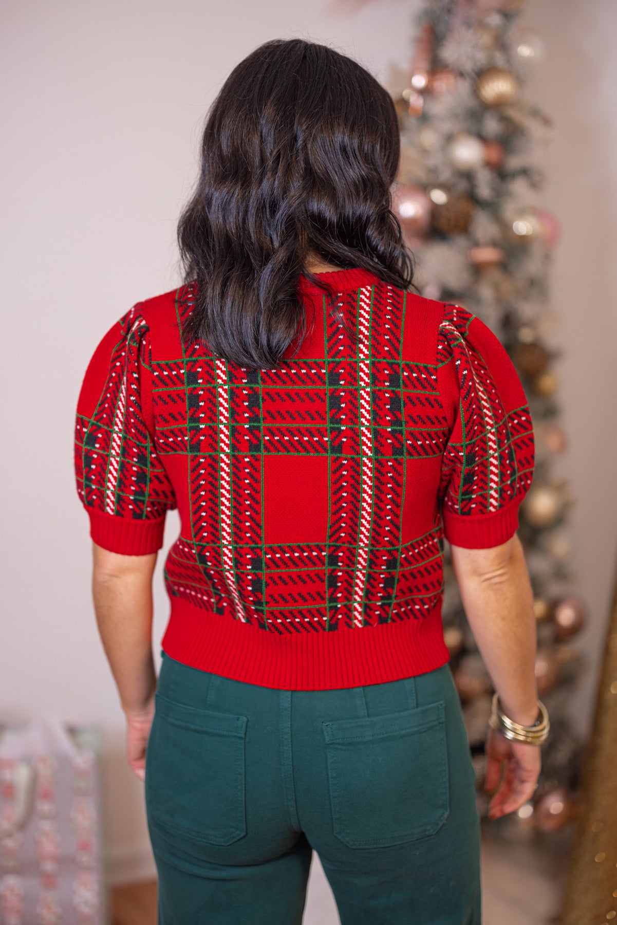Elevate your holiday wardrobe with the Casey Checkered Plaid Red Sweater. This cropped essential features a timeless red and green plaid design that instantly captures the festive spirit. The versatile cut works beautifully across occasions—from Christmas photo sessions to seasonal gatherings. Easily dress her down with sneakers! Shop the look: Dark Green Wide Leg Risen Jeans