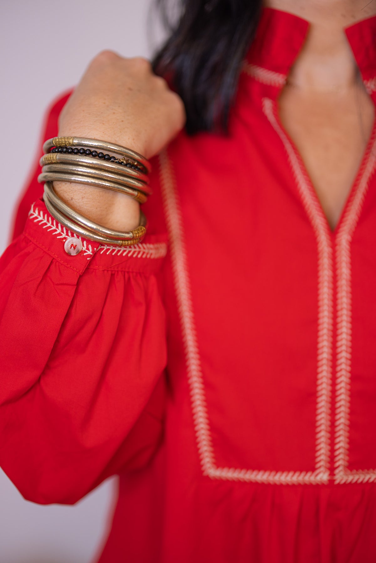 This playful red poplin dress features delicate taupe stitching that adds subtle charm throughout. The V neckline is accented by a flirty ruffle trim around the neck, while long sleeves and ruched details create a flattering silhouette. A tiered bottom hem adds extra movement and fun, making this dress perfect for dancing the day (and night) away!