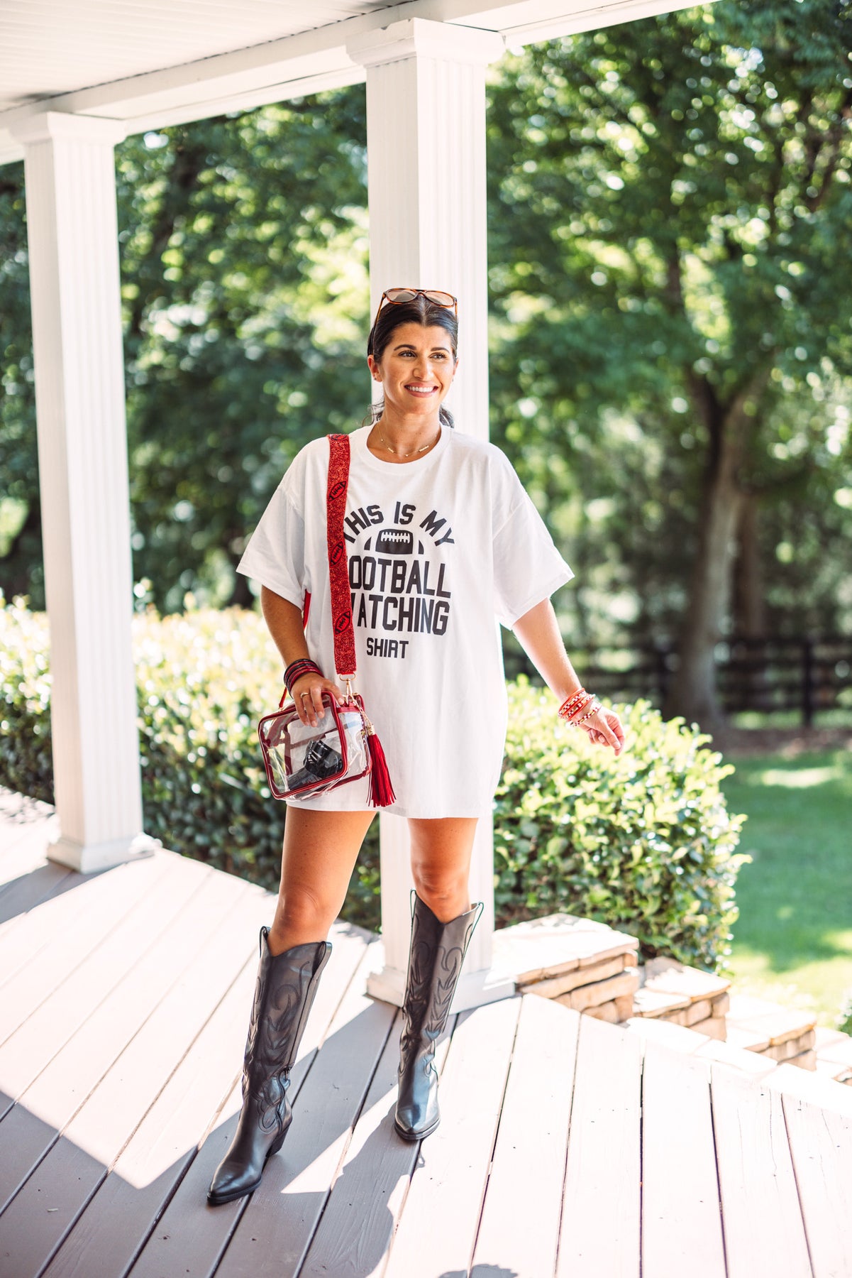 Get ready for the ultimate game day experience with our Football Watching Tee. Show off your passion for the sport with this trendy white t-shirt, featuring a playful graphic that proudly declares, “This Is My Football Watching Shirt.” Perfect cheering on your favorite team at any game or tailgate parties and casual outings, it combines comfort with a fashion-forward look.