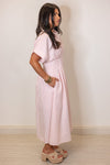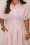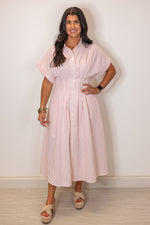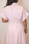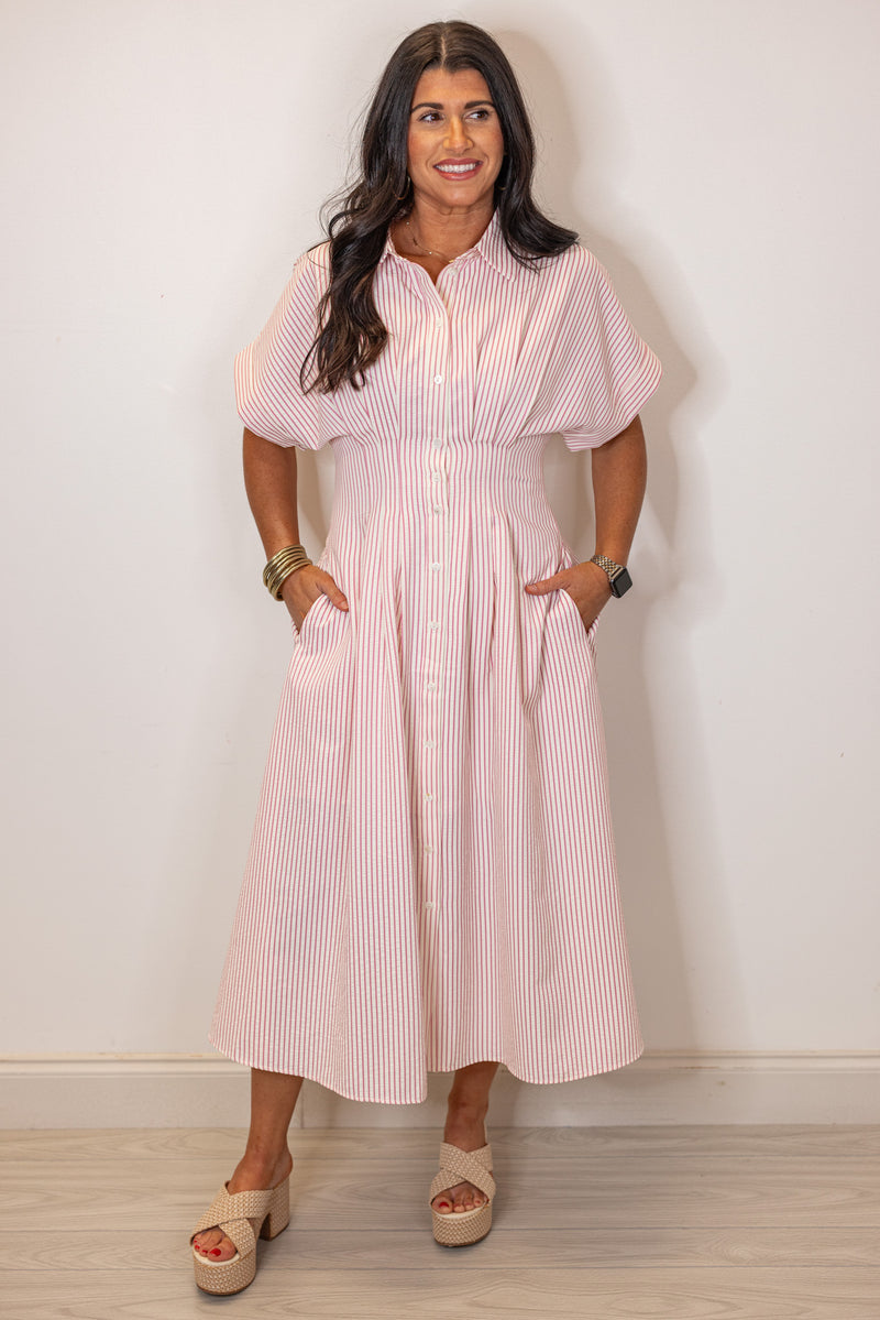 This playful pink midi dress features a striking stripe print, short sleeves, and a classic collar with front button closure. Pin tuck detailing and side pockets add an extra touch of charm. A very flattering and slimming dress with the cinched waist!