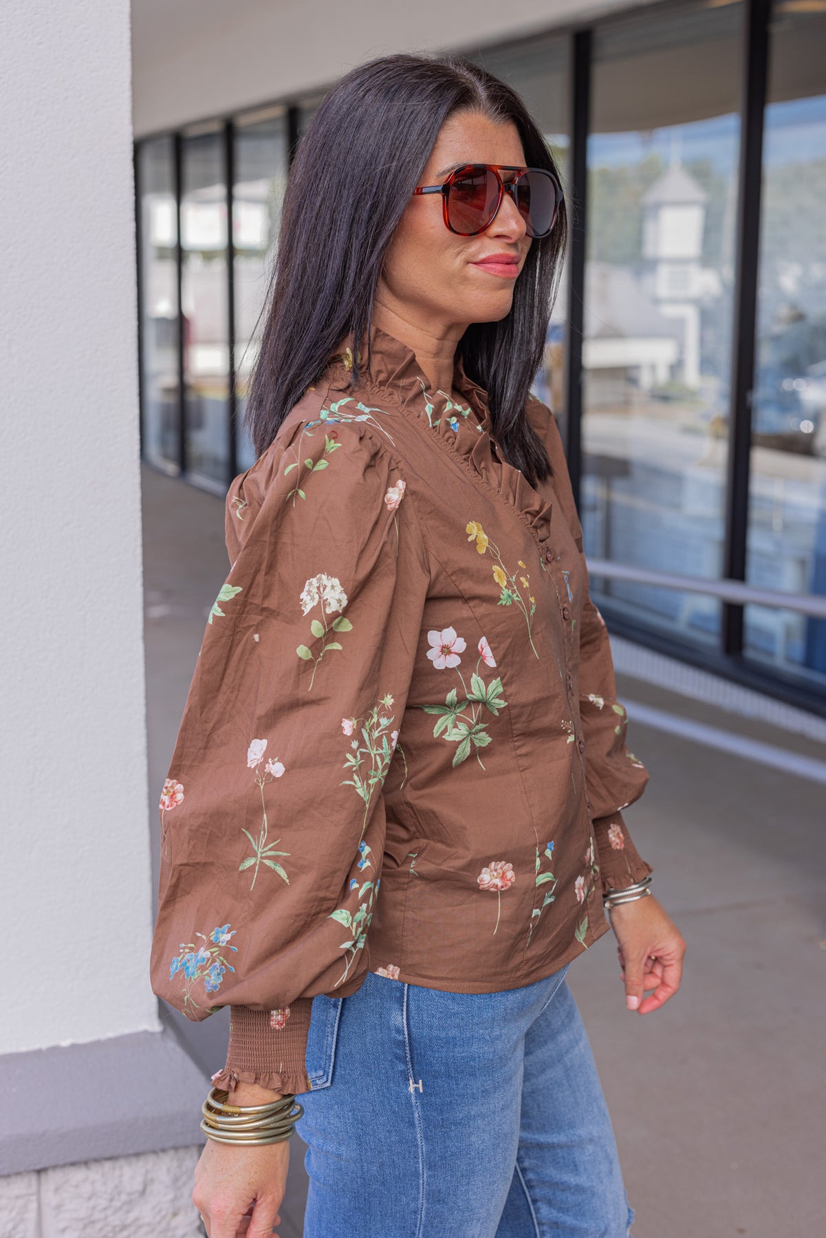 Embrace the season with the Autumn Escape Brown Floral Top, featuring a lively multicolor floral print poplin fabric that brightens any day. Its playful ruffle trimmed v neckline and button front closure add charming details, while long balloon sleeves bring a whimsical touch. Taking you from work to weekend!