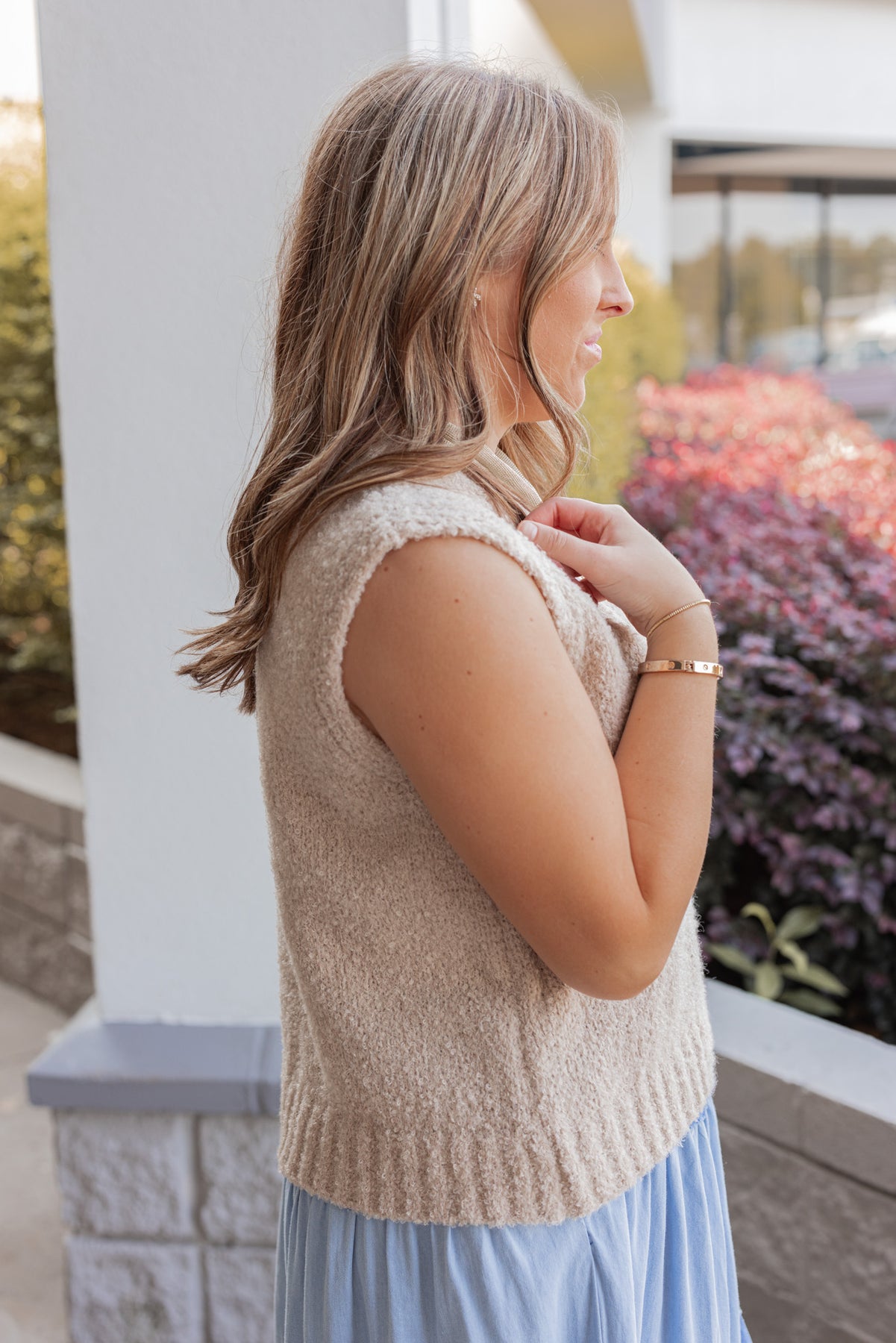 Cozy meets chic with this Boucle Dramatics Natural Sleeveless Sweater! Crafted from soft boucle knit, it hugs you in warmth while keeping things cool with a sleek crew neckline and sleeveless cut — perfect for layering or wearing solo. Add a little drama to your everyday look effortlessly! Shop the look: Skirt | Boots