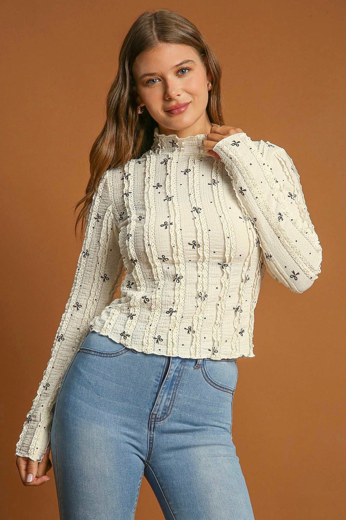 Umgee natural textured top with black bow tie print, and lace ruffles throughout