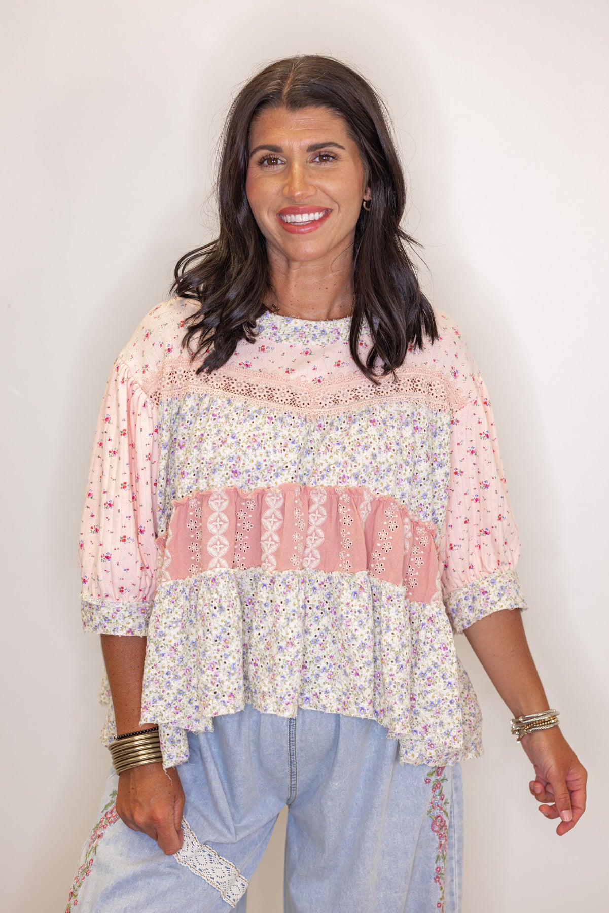 Embrace a playful vibe with this Perfect Patchwork Pink Floral Top, featuring a charming mix of pink and ivory fabric with multicolor floral prints. Delicate embroidery and eyelet details add a touch of whimsy, while ruffle tiers and puff sleeves bring flirty volume and movement. Shop the look: Pants | Sneakers