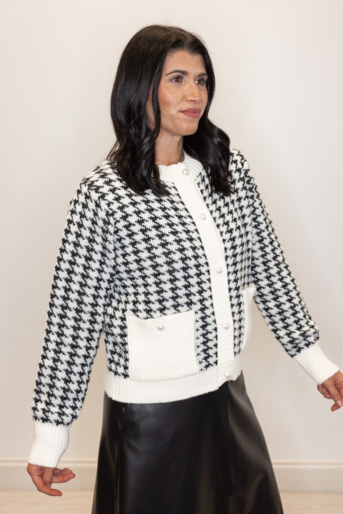 Channel your inner icon with this chic houndstooth set inspired by timeless elegance! The black and ivory knit tank pairs perfectly with the matching button-front cardigan adorned with lustrous pearl buttons—a nod to classic sophistication. Wear each piece solo, or layer them up for effortless style that whispers old-money charm. Perfect for anyone who appreciates a touch of vintage glamour with modern versatility! Shop the look: Black Faux Leather Skirt