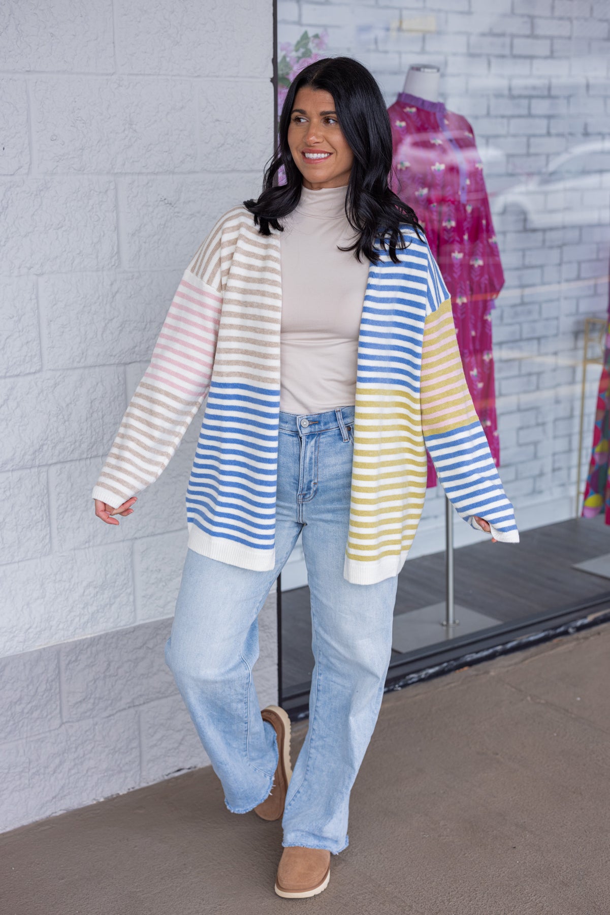 Layer up with personality in this Sassy Stripes Blue Colorblock Cardigan! Featuring blue, taupe, pink, olive and cream stripes in a modern colorblock design, this knit cardigan brings instant charm to any outfit. The open front silhouette lets you style it over your favorite tees or dresses, while ribbed trim at the cuffs and hem keeps everything polished and put-together. Perfect for adding a pop of color and fun to your everyday wardrobe!