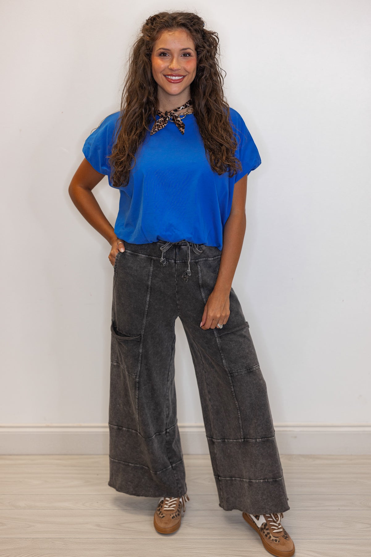 Bubble hems are THE CUTEST! Check out this adorable pacific blue knit top, featuring gathered elastic short puff sleeves, and a trendy bubble hem, all in a semi-cropped style. Trendy and so versatile - an elevated closet staple! Styled with the MOST COMFY and versatile pants ever - shop them here!!