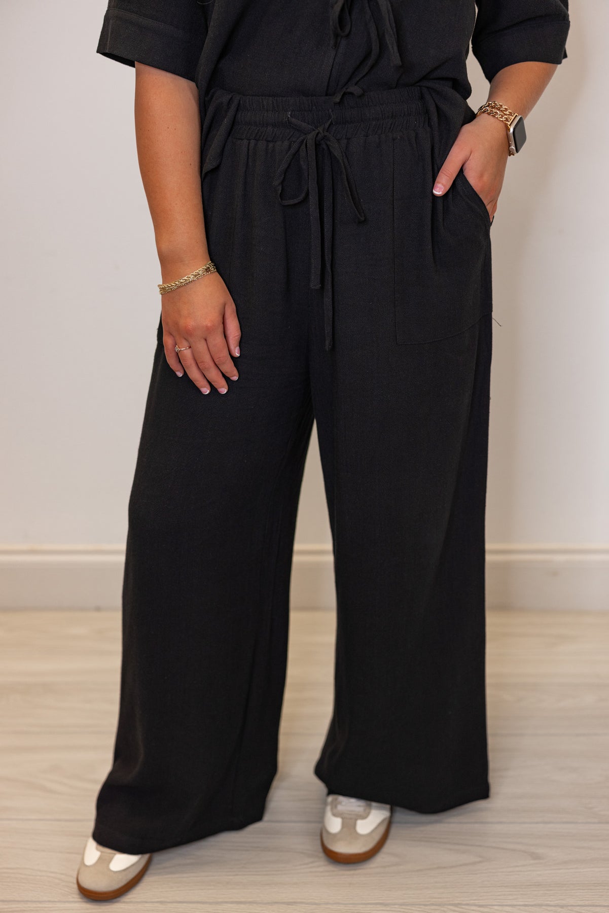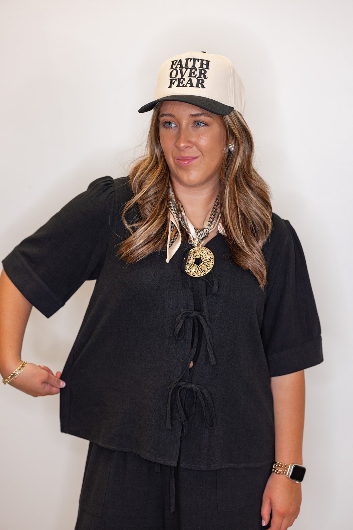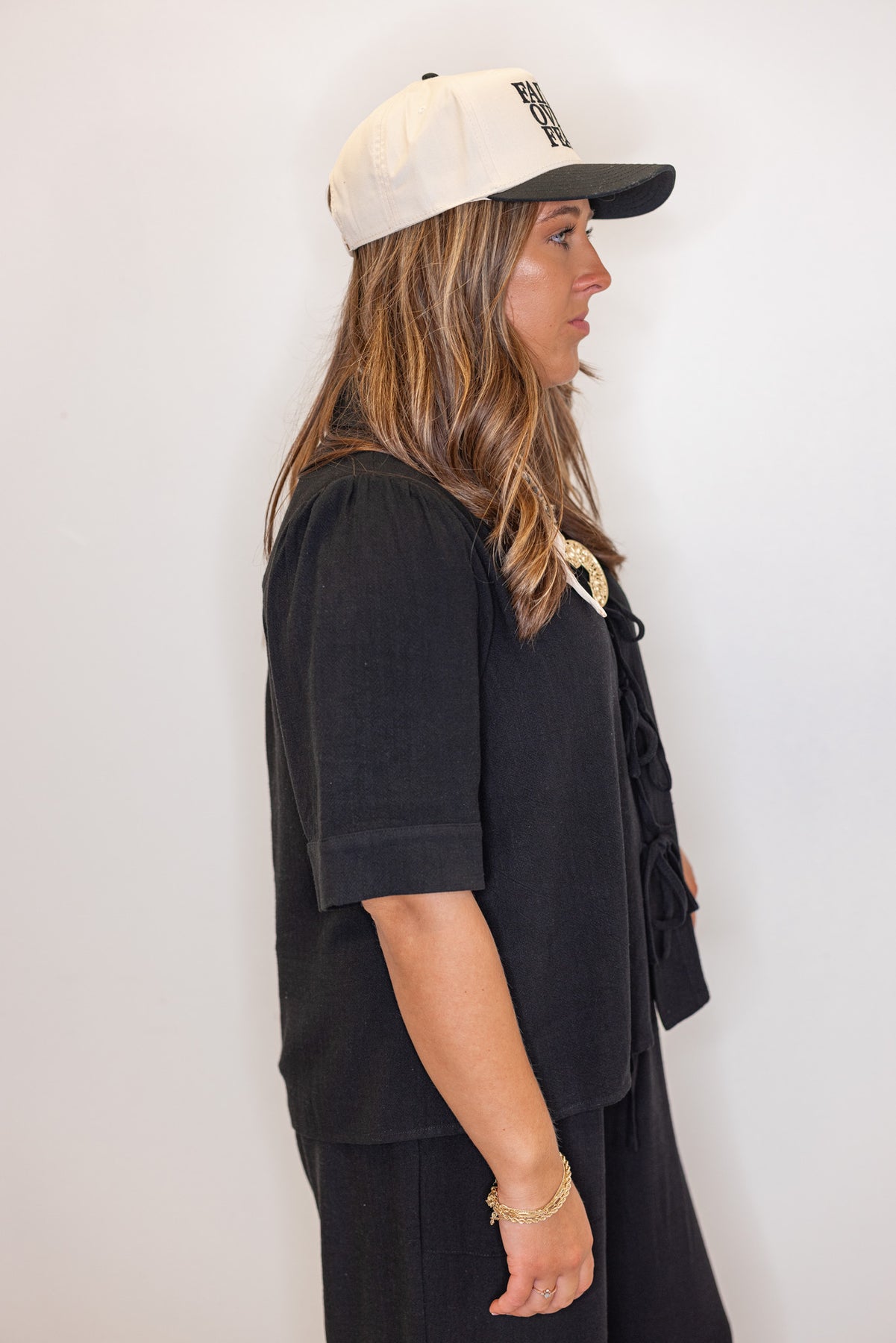 This Linen Delight set will be your new fave go-to outfit! Short sleeve top with a bow tie bodice, and drawstring elastic waist pants, in a lightweight linen fabric. The perfect blend of trendy and comfort - just right for all of those fun upcoming festivities.