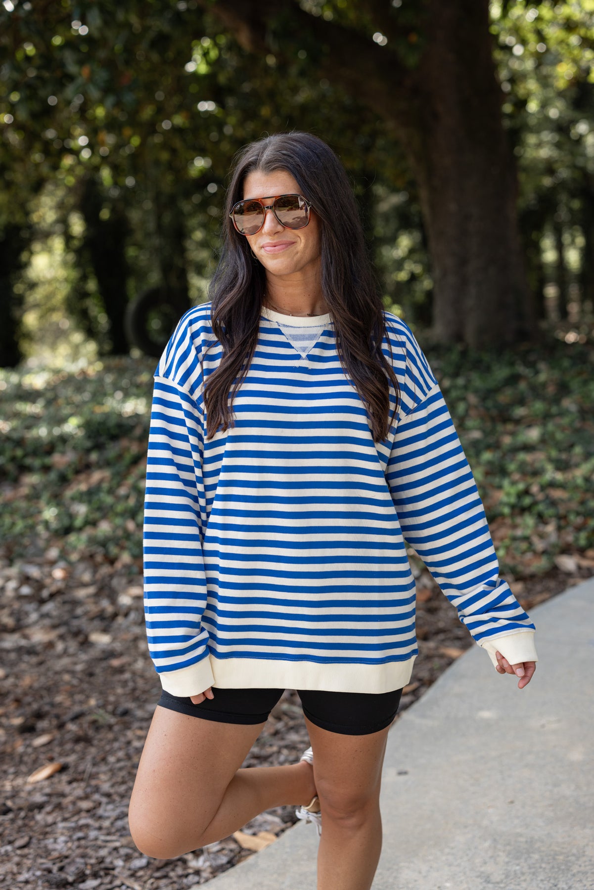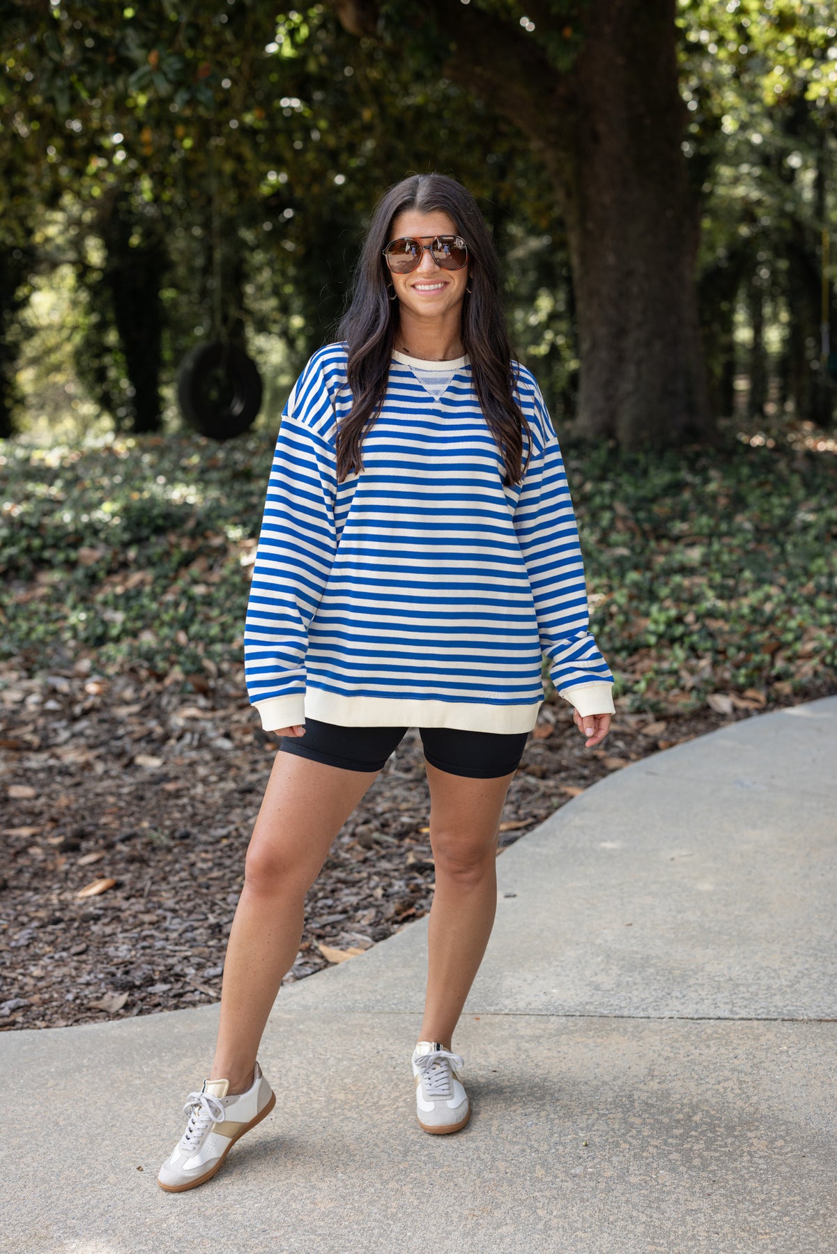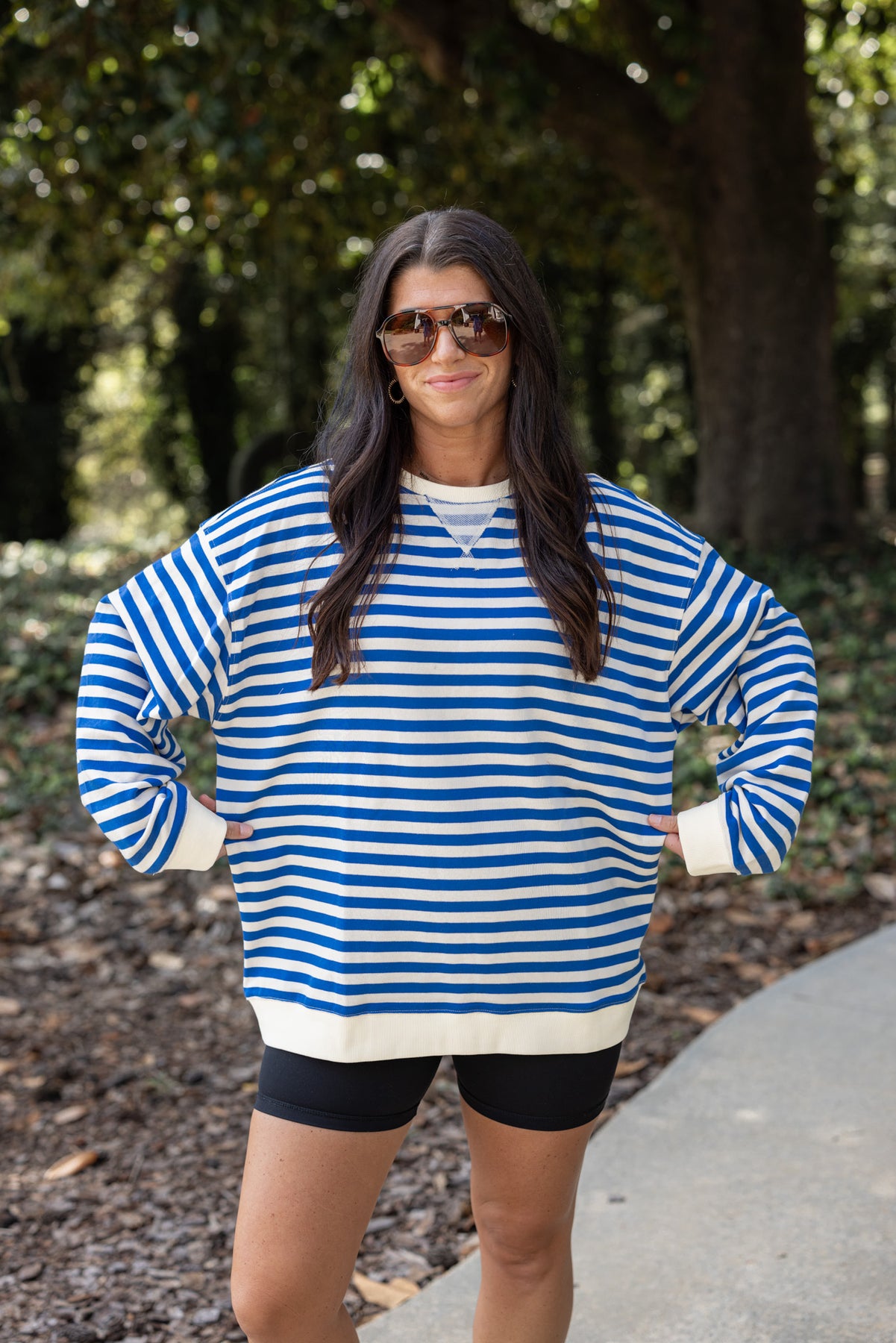 Get your perfect striped look on with our Striped Coziness pullover! This relaxed fit cutie features a trendy royal blue and ivory striped terry knit fabric, with reverse seams, and a crew neckline that has a contrasting fabric v detail. Stay cozy and stylish all season long!