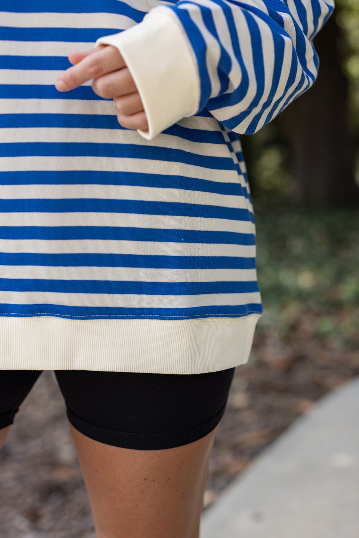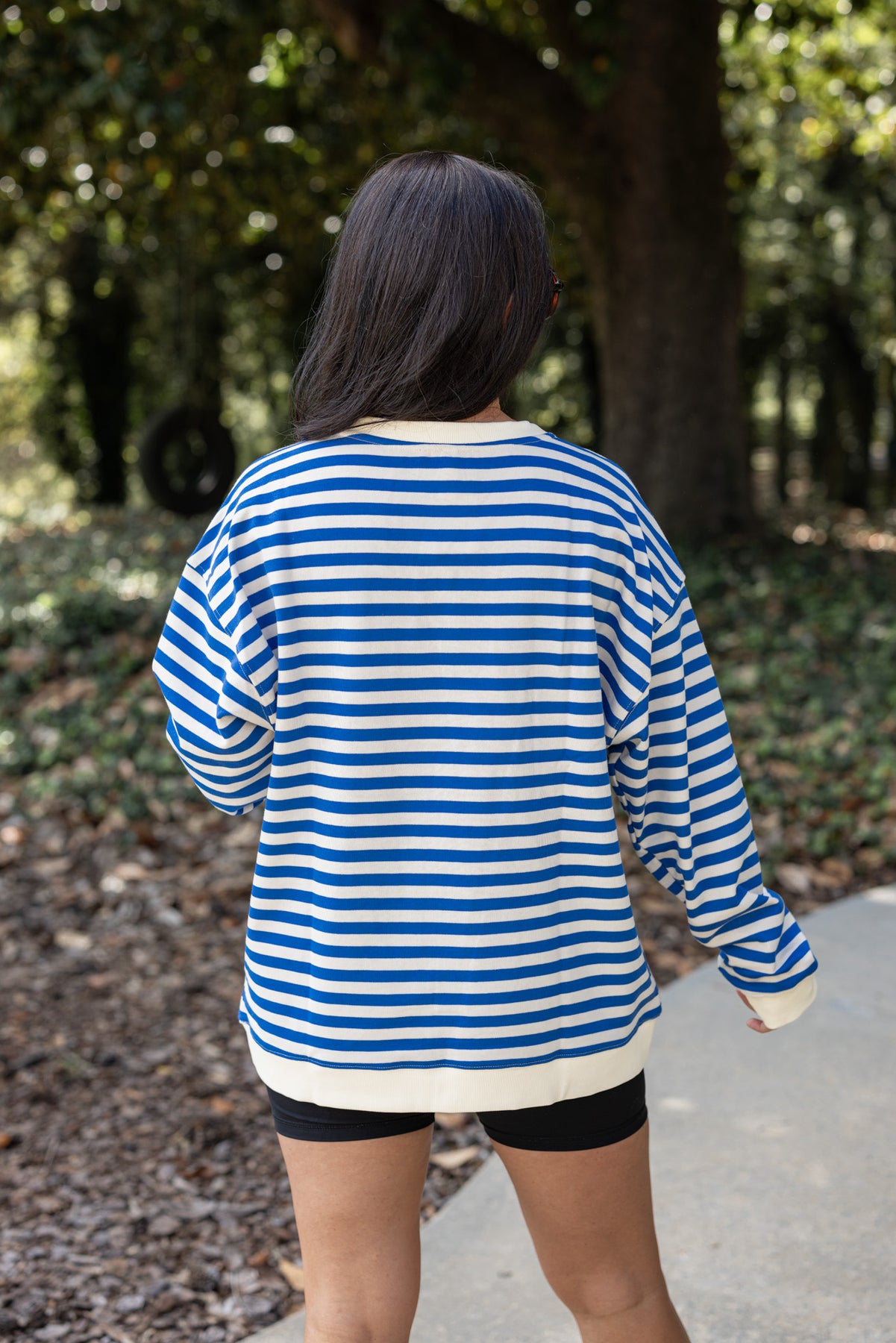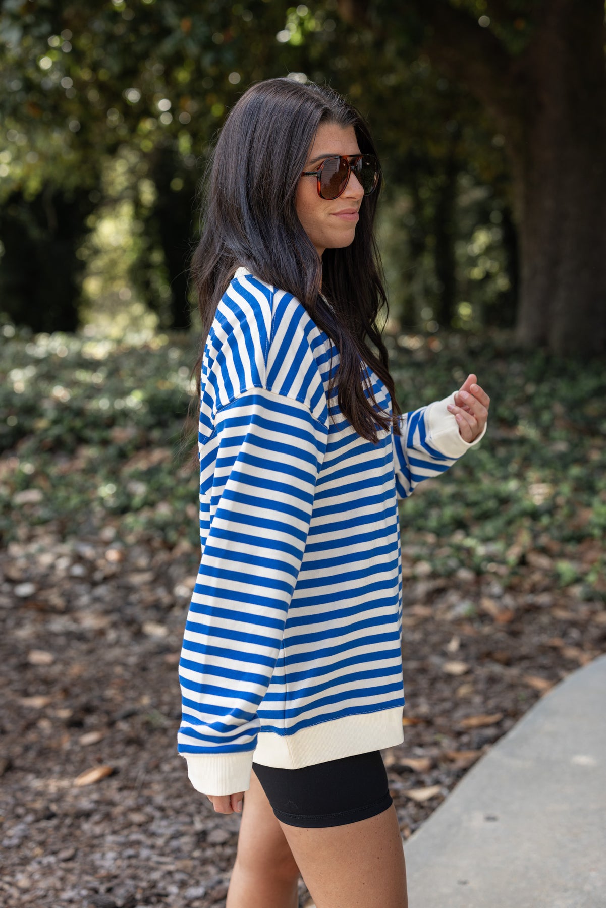 Get your perfect striped look on with our Striped Coziness pullover! This relaxed fit cutie features a trendy royal blue and ivory striped terry knit fabric, with reverse seams, and a crew neckline that has a contrasting fabric v detail. Stay cozy and stylish all season long!