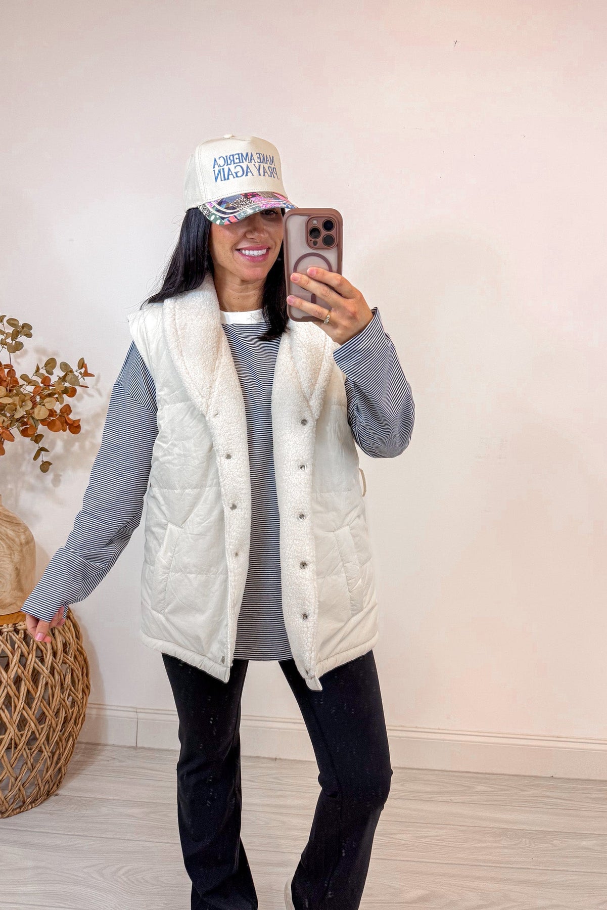 Stripes never go out of style, and this oversized knit top proves it! Featuring a classic navy blue and white striped pattern with a cozy crew neckline and long sleeves, it's the perfect striped piece for any season. The side slits at the hem add just the right amount of movement and edge. Throw it on with your favorite leggings or dress it up—this versatile top does it all! Shop the look: Spanx Booty Boost Flare Leggings | Reversible Vest | Shoes