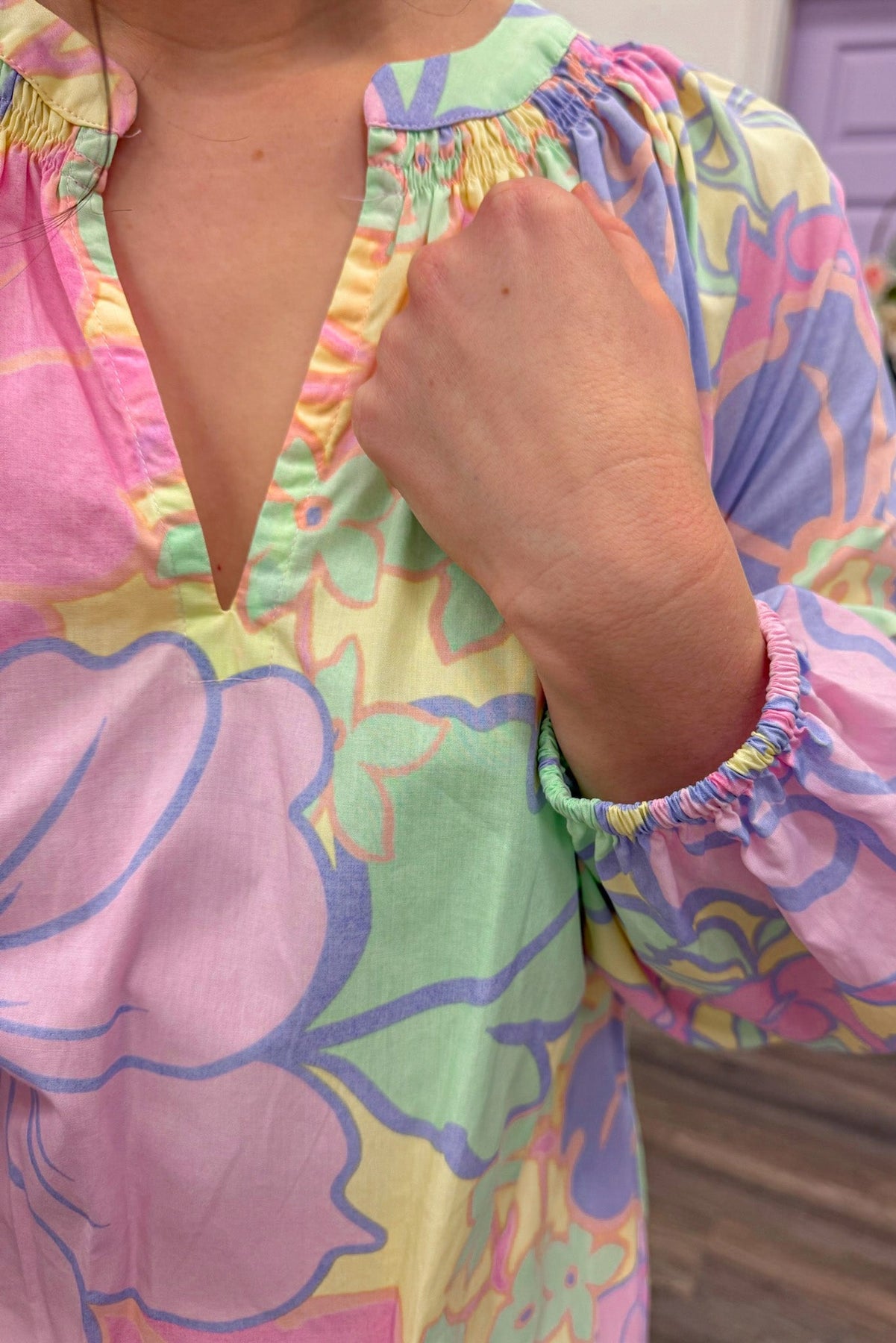Step into whimsy with this Karlie maxi dress, featuring a gorgeous pastel large floral print that's as a pretty as a garden! The V-neckline showcases charming ruched details, while 3/4 balloon sleeves add a touch of vintage flair. Adjust the self-tie belt to flatter your silhouette, and watch the ruffled tiered hem create movement with every twirl. A playful pick for anyone craving effortless elegance with personality!