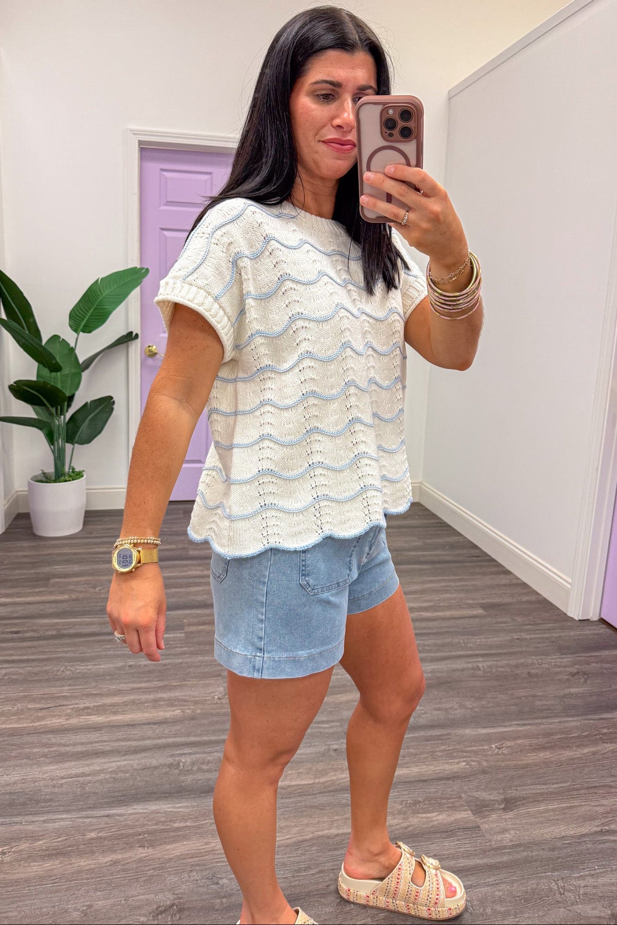 Elevate your Summer wardrobe with this charming wave striped top! Designed with cream scalloped knit fabric accented with textured light blue wave stripes, this top offers a playful yet stylish look. The crew neckline and short sleeves ensure comfort, while the scalloped bottom hem adds a touch of whimsy. Perfect with shorts for casual outings or skirts for dressed up occasions - versatile and oh-so trendy! Shop the look: Denim Shorts