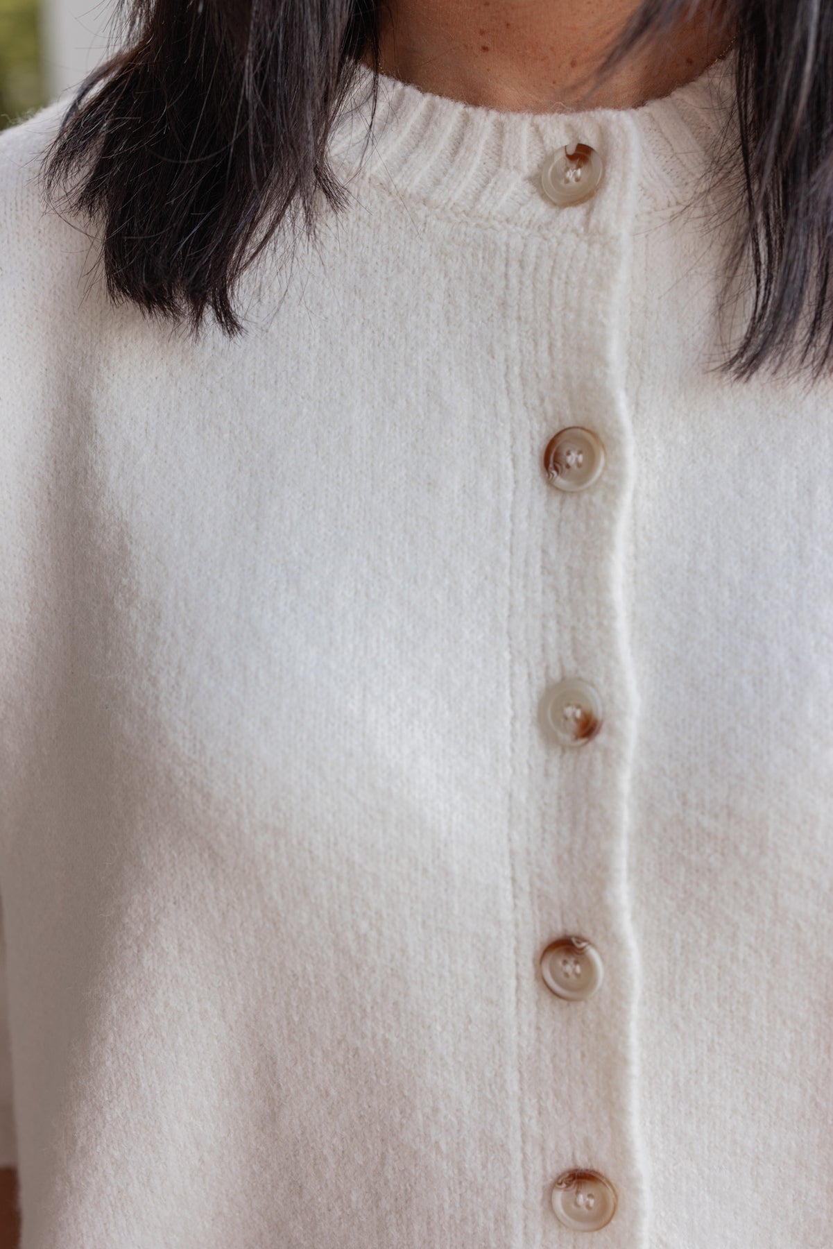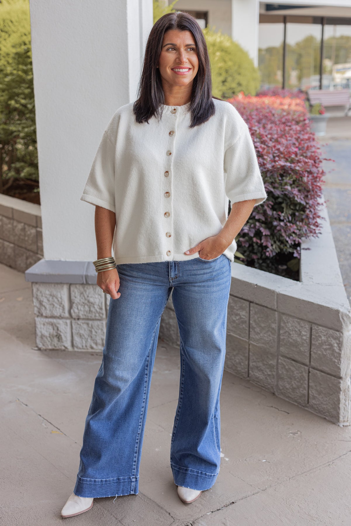 Jump on the cozy trend with this adorable knit top! Featuring brushed knit fabric in off white, with a button front closure, and comfy 1/2 length sleeves. The ideal top for the upcoming seasons, whether worn casually with sneakers or dressed up with a skirt and boots - perfect buttoned up, or left open as a layering piece!