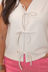 Add a touch of playfulness to your wardrobe with our Lovely Bows Oatmeal Ribbed Top! The bow tie closure bodice provides a flirty twist, while the oatmeal ribbed knit fabric adds a classic vibe. The sleeveless vest style completes this sassy unique look while remaining a timeless closet staple!