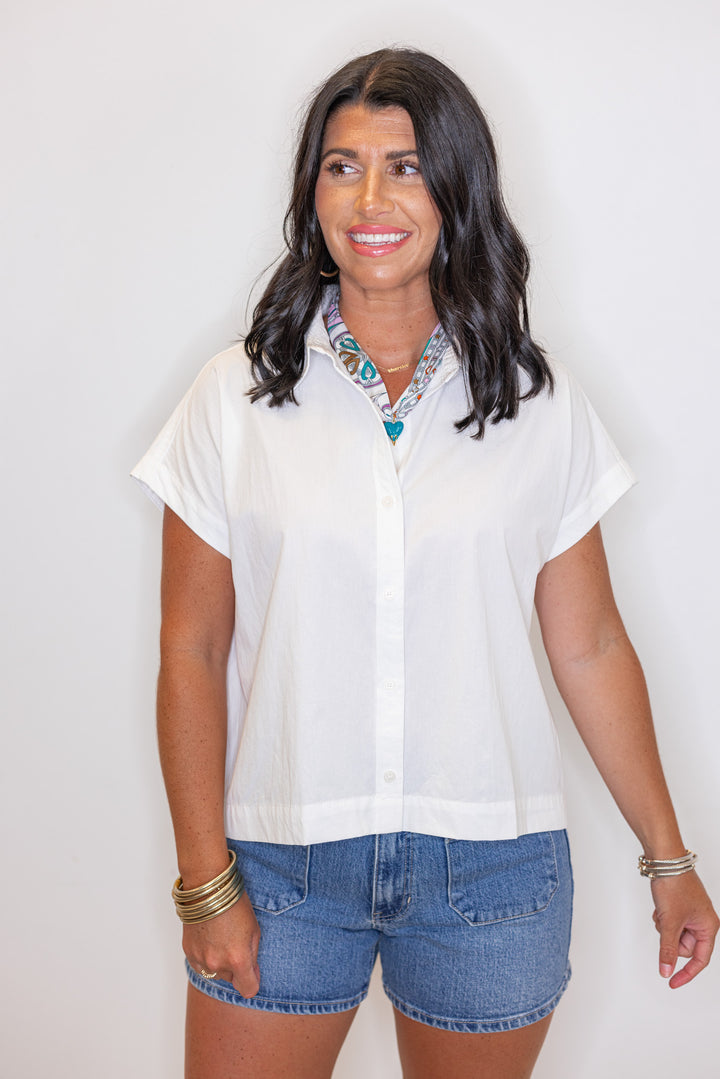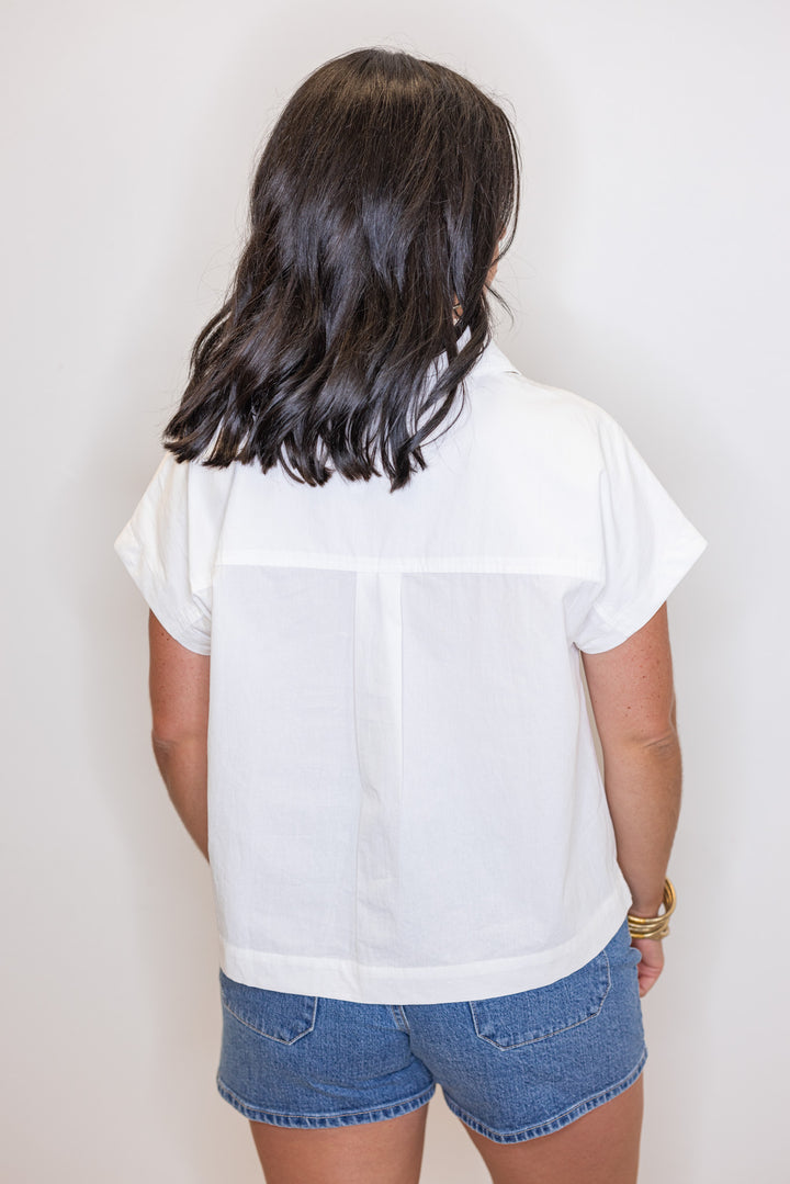 Stay cool and stylish in our Poplin Perfection Off White Top! This breezy poplin top features a classic button down front with a collar, perfect for any casual occasion. Its short sleeves and semi-cropped design add a touch of playfulness to your outfit! A timeless closet staple!