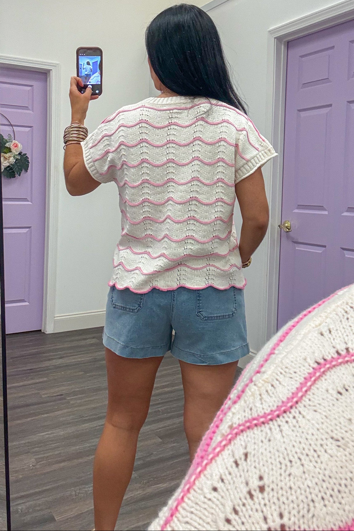 Elevate your Summer wardrobe with this charming wave striped top! Designed with cream scalloped knit fabric accented with textured light pink wave stripes, this top offers a playful yet stylish look. The crew neckline and short sleeves ensure comfort, while the scalloped bottom hem adds a touch of whimsy. Perfect with shorts for casual outings or skirts for dressed up occasions - versatile and oh-so trendy! Shop the look: Denim Shorts