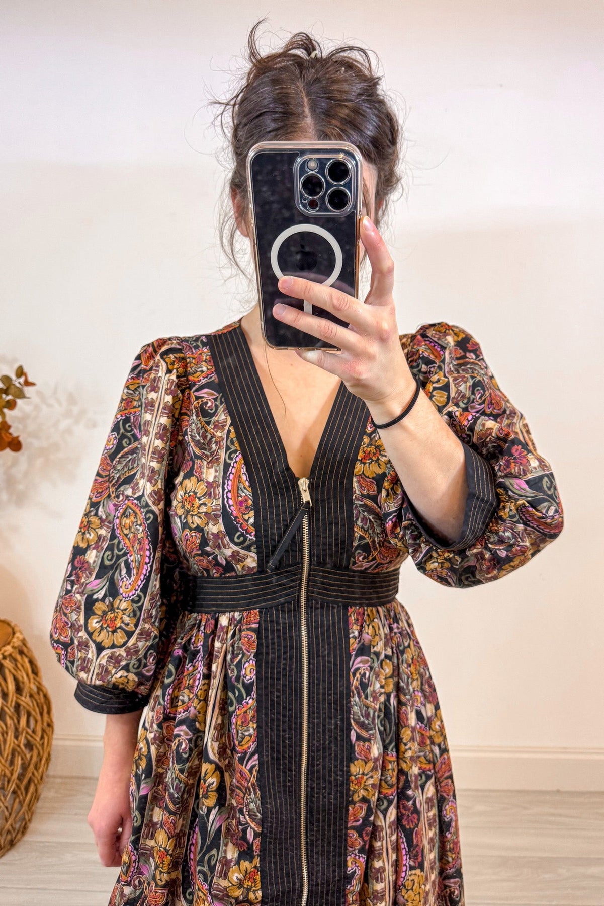 Women's black and multicolor paisley floral print midi dress with zipper front closure