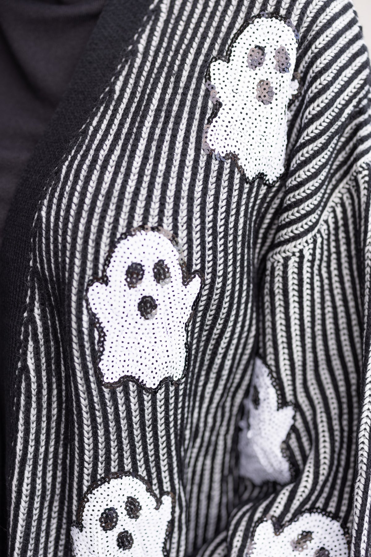 This playful open-front cardigan features a cozy black and white striped textured knit adorned with sparkling white sequin ghosts throughout. Perfect for adding a fun and festive touch to your Halloween wardrobe, it’s great for layering and bringing out your spooky style!