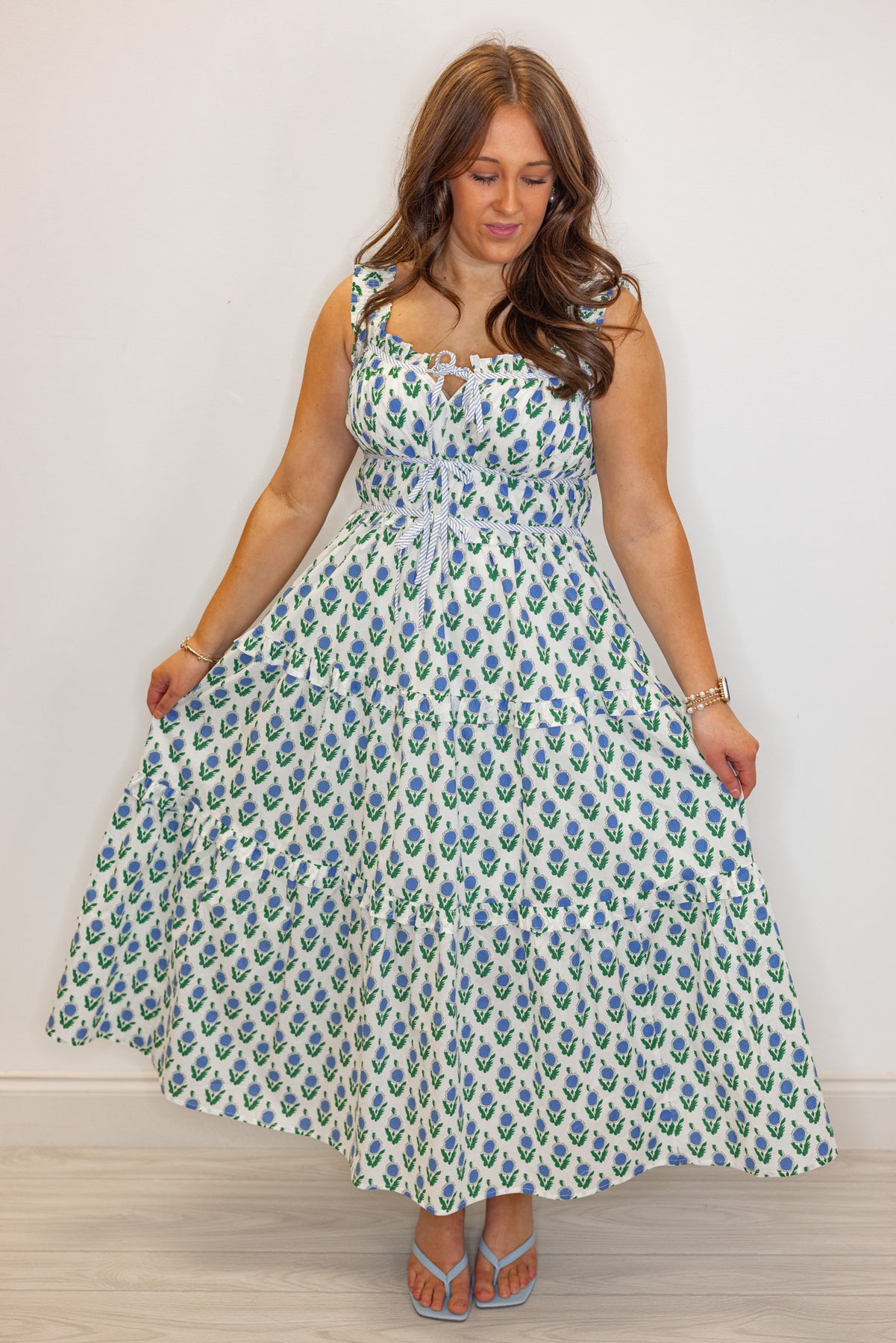 Get ready to turn heads in the Blue Floral Visions Midi Dress! This off white dress features a stunning blue and green floral print, smocked shoulder straps, a charming sweetheart neckline, and ruffle details throughout. The blue and off white striped trim adds a playful touch, while the bow ties down the front bodice give it a unique twist. Perfect for any occasion, this dress will have you feeling trendy and fab!