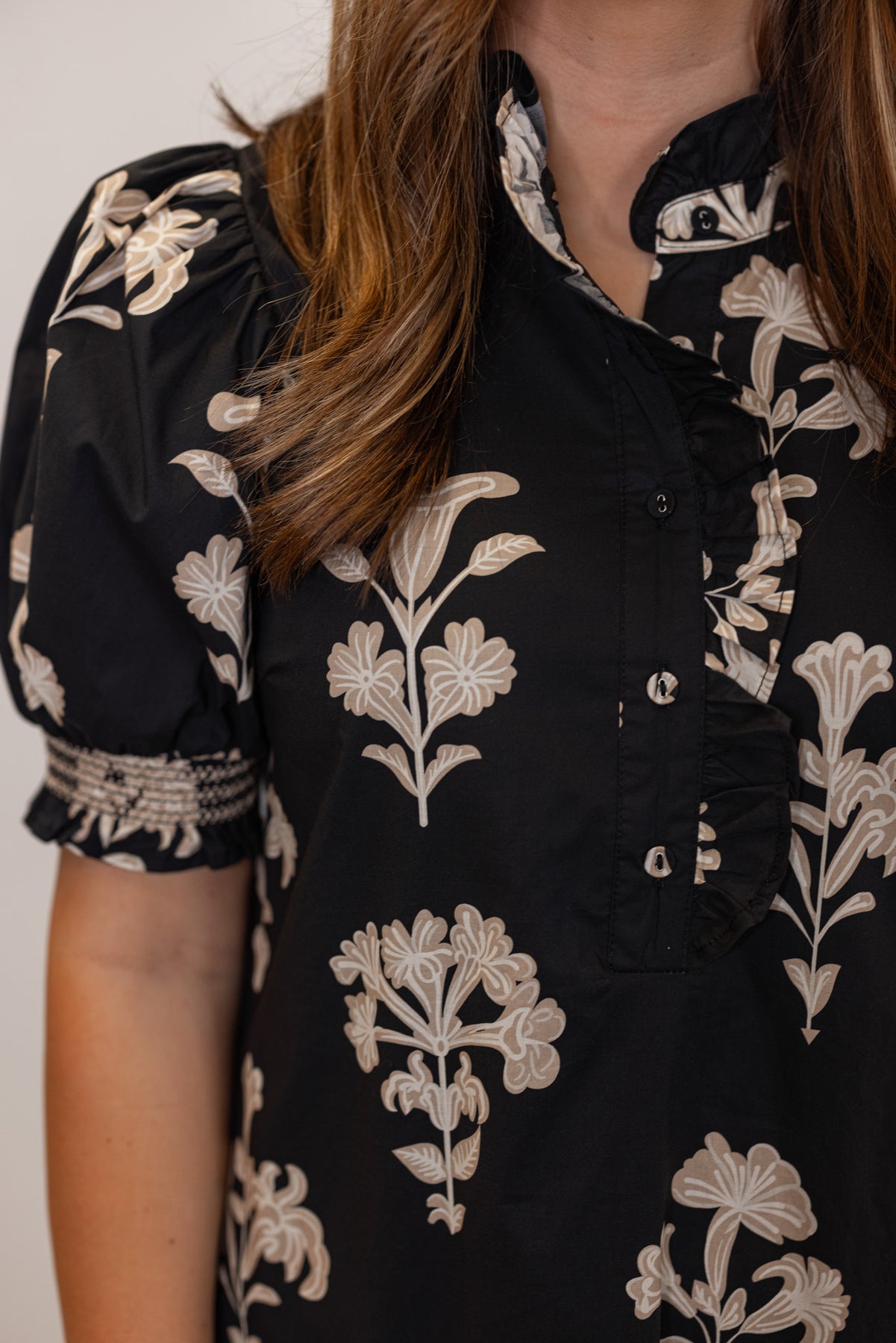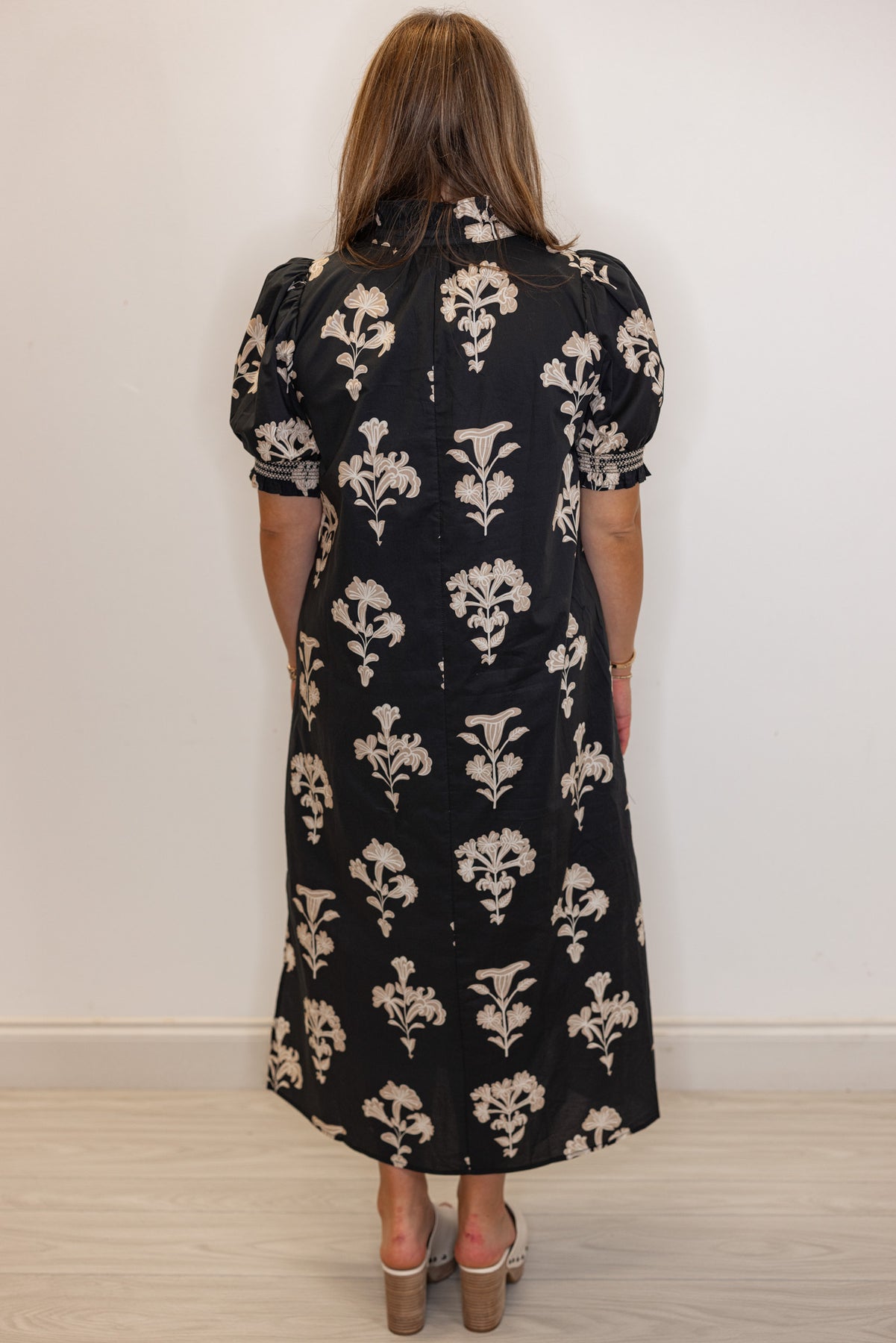 Women's black midi dress with taupe botanical floral print and ruffle and button detail