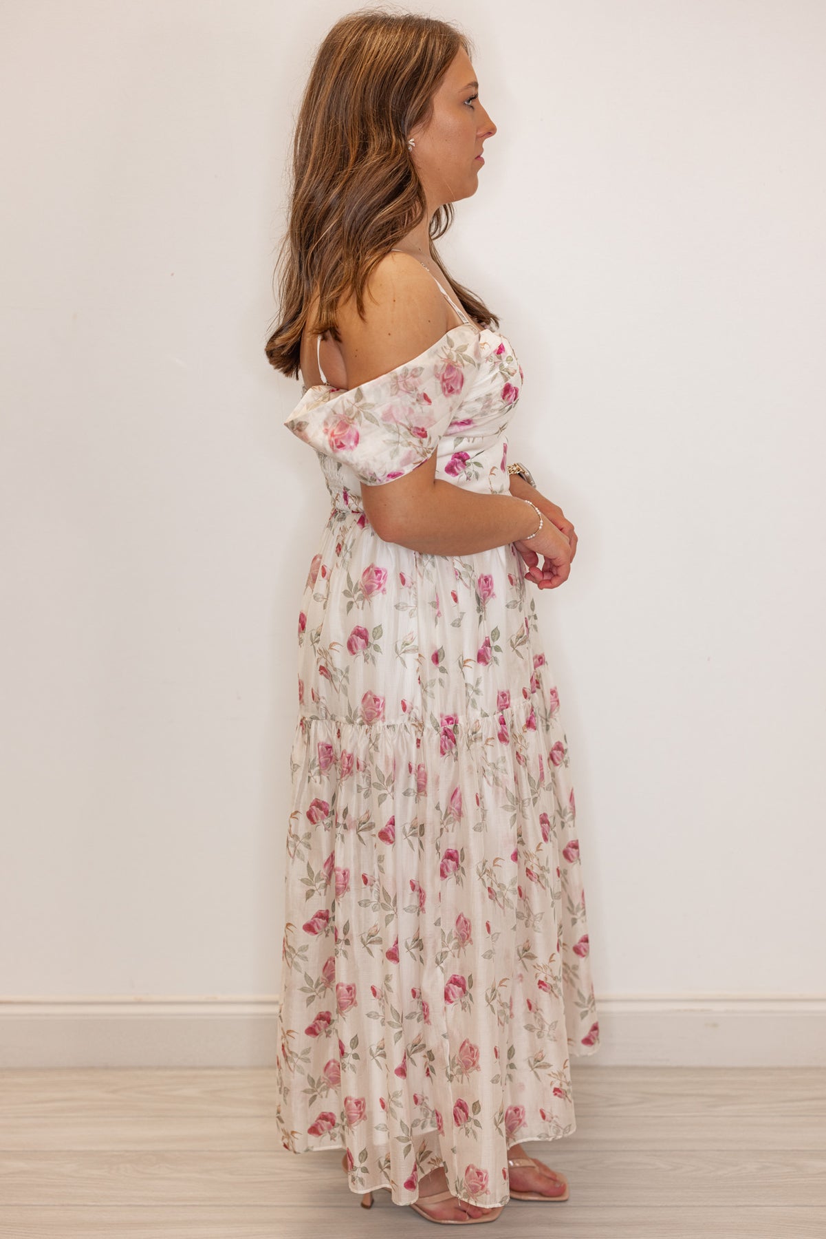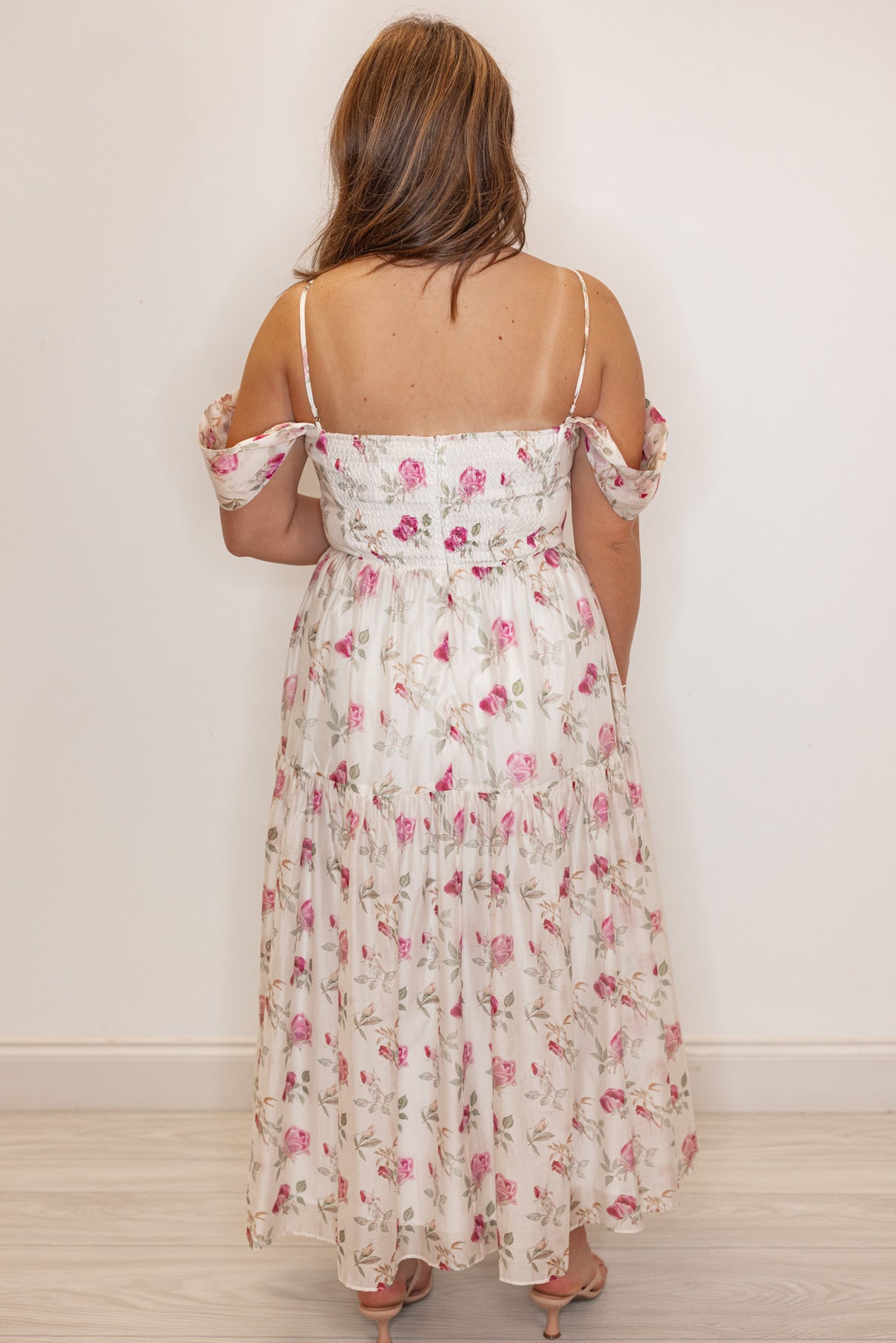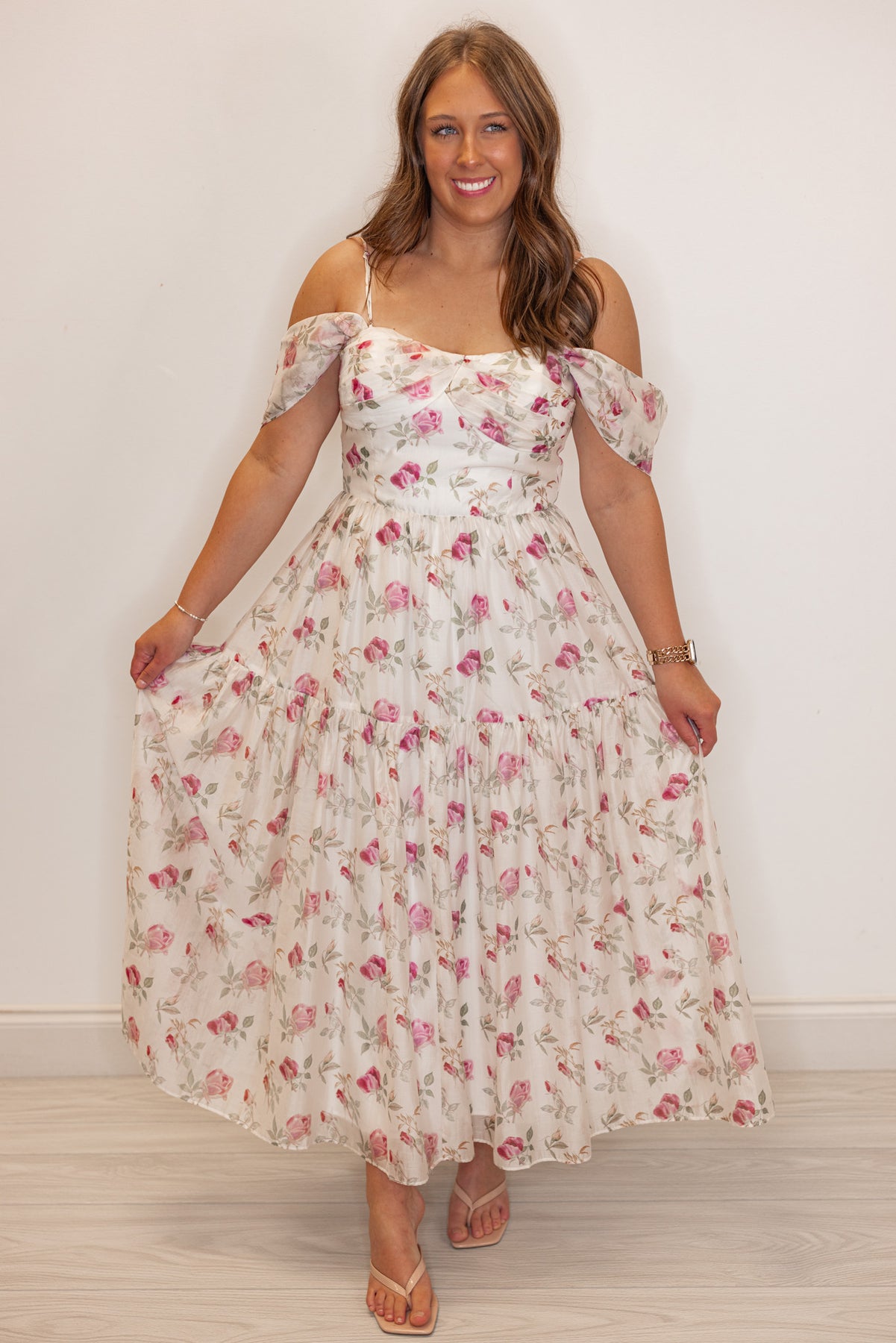 Get ready to bloom with the Catarina Floral Midi Dress! The off white fabric has a beautiful light pink, dark pink, and green floral print, while the sweetheart neckline, and spaghetti straps with off the shoulder sleeves add a touch of sweetness. Ruched bodice detailing and a tiered skirt make this dress even more charming. Perfect for any occasion, this dress is a must-have for your wardrobe!