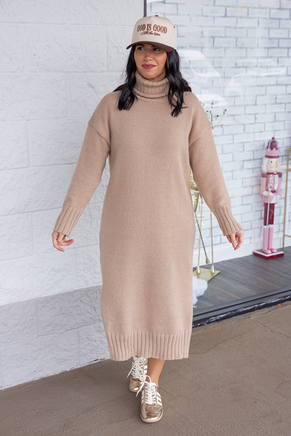 Wrap yourself in full coziness with this charming taupe knit midi sweater dress! The ribbed turtleneck adds timeless appeal, while long sleeves keep you cozy through any season. A ribbed hem with cheeky side slits is the perfect balance between classic and contemporary—practical enough for everyday wear, playful enough to turn heads. Whether you're channeling vintage vibes or creating fresh memories, this piece is your go-to for effortless style that feels like a warm hug! Shop the look: Brown Vest | Hat | Sneakers