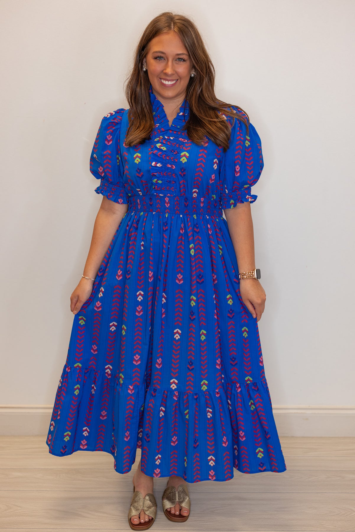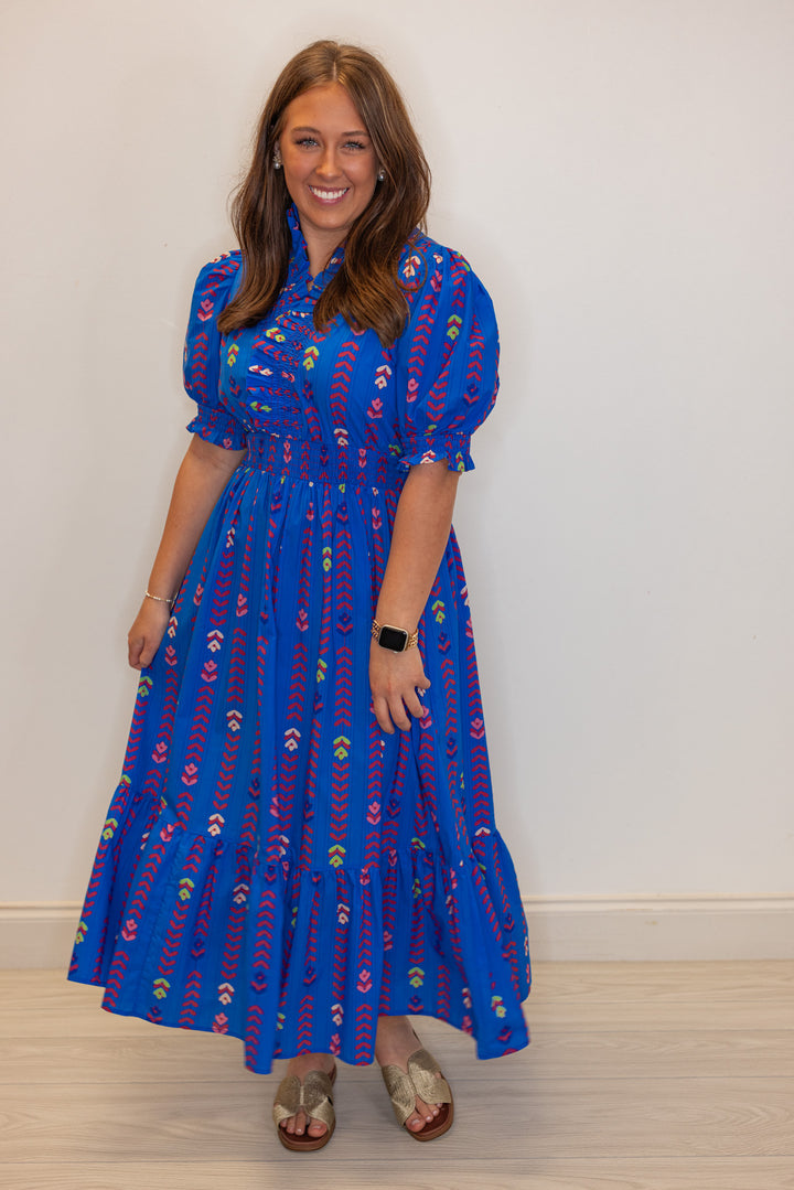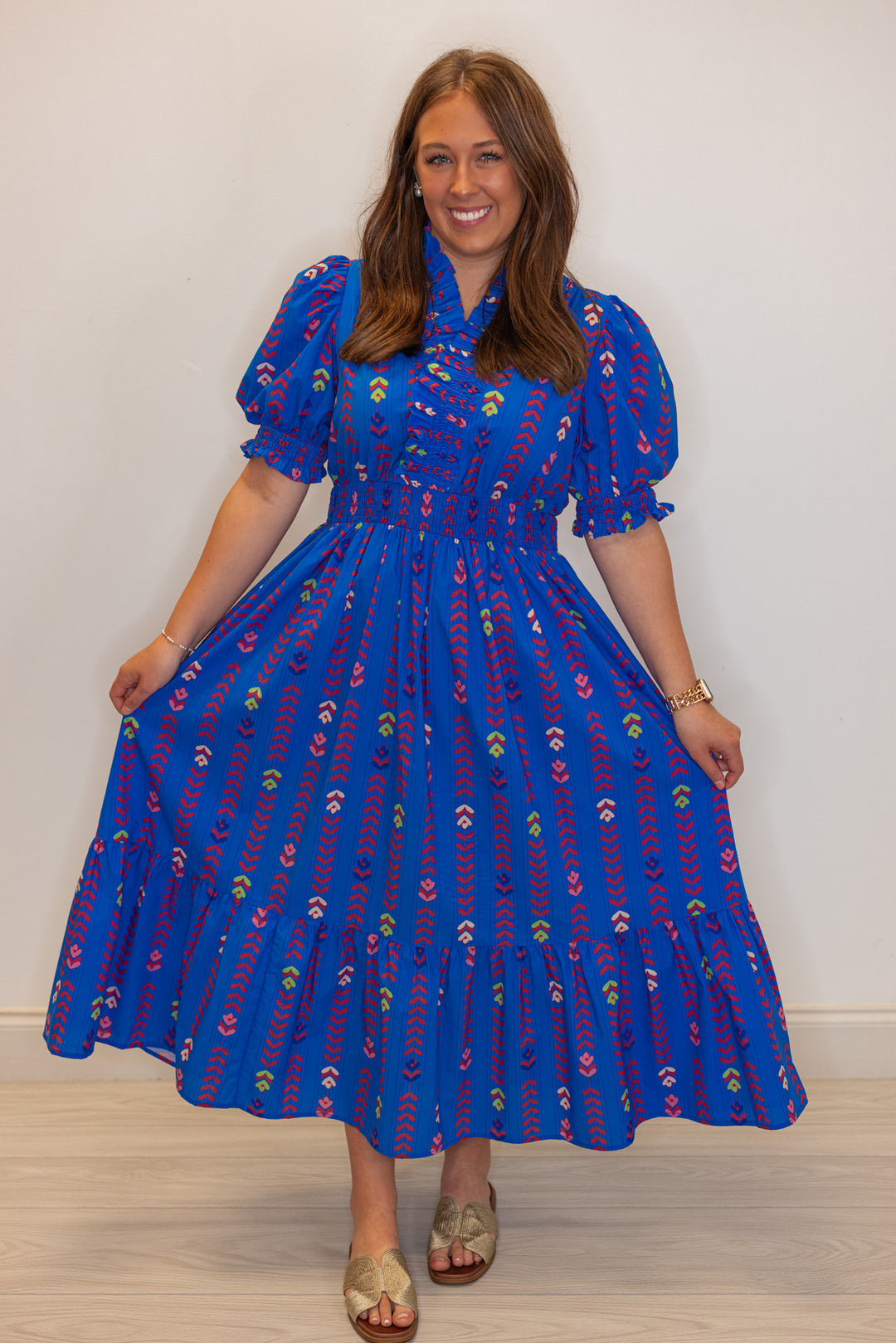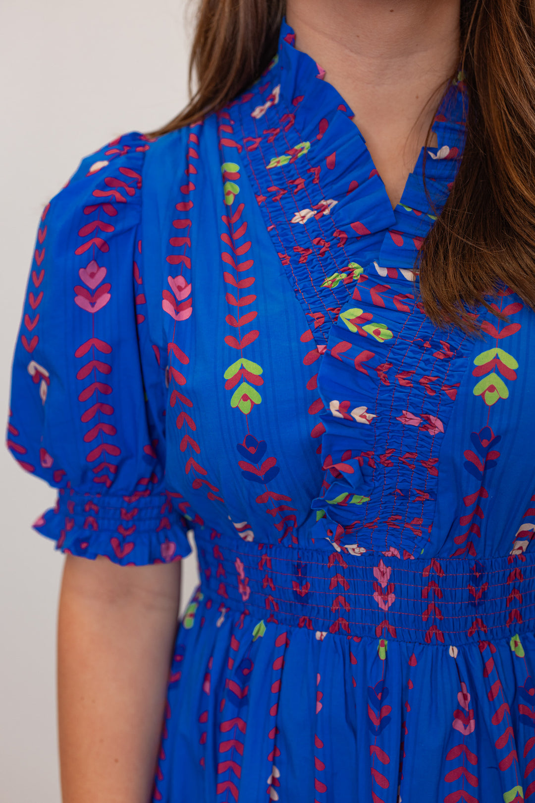 Summer calls for pretty petals! Check out this lovely midi dress in blue and brick red petal print - with multicolor petals mixed in - featuring a ruffle trimmed neckline and bodice, and a flattering smocked waistline. The perfect flirty addition to your wardrobe!