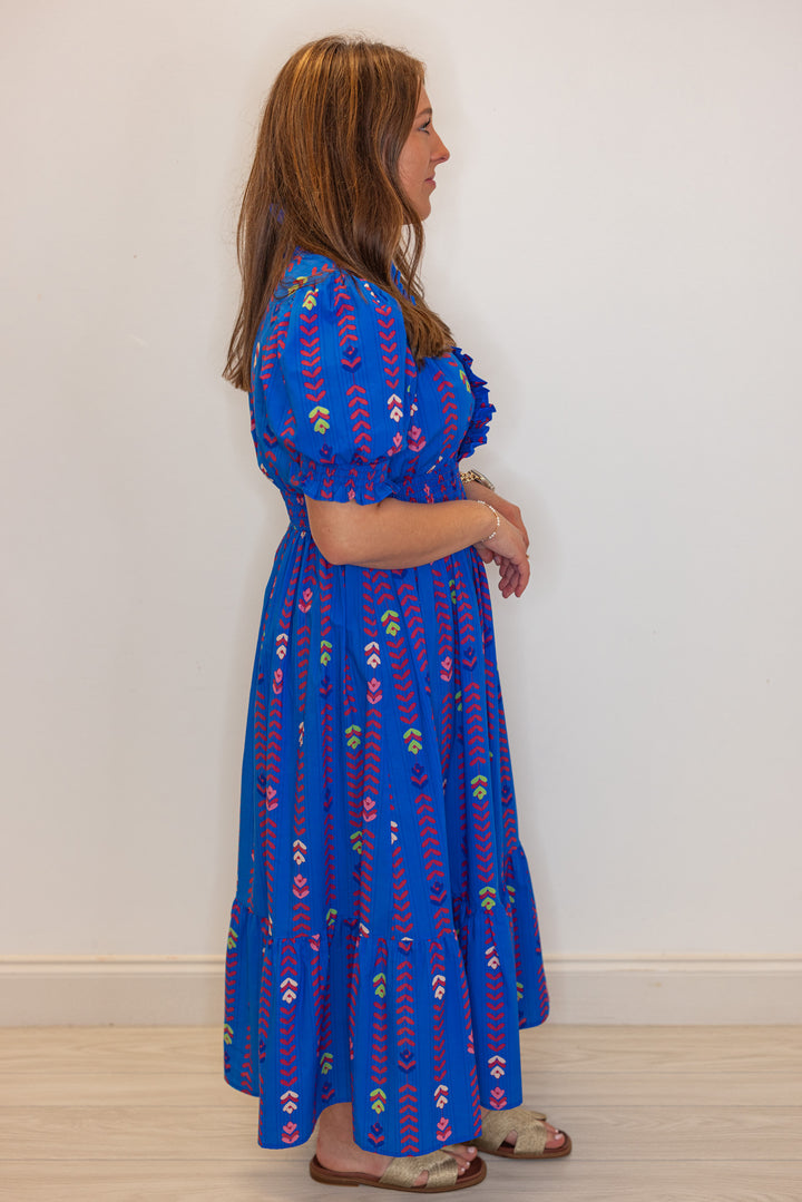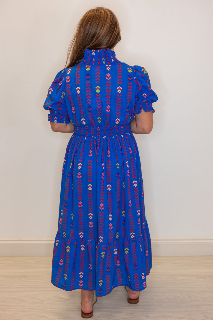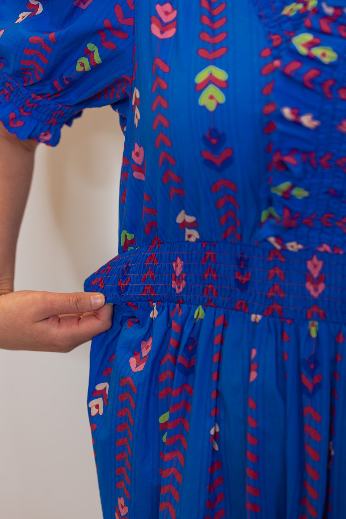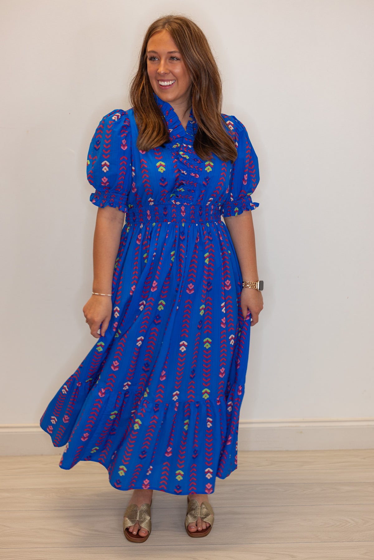 Summer calls for pretty petals! Check out this lovely midi dress in blue and brick red petal print - with multicolor petals mixed in - featuring a ruffle trimmed neckline and bodice, and a flattering smocked waistline. The perfect flirty addition to your wardrobe!