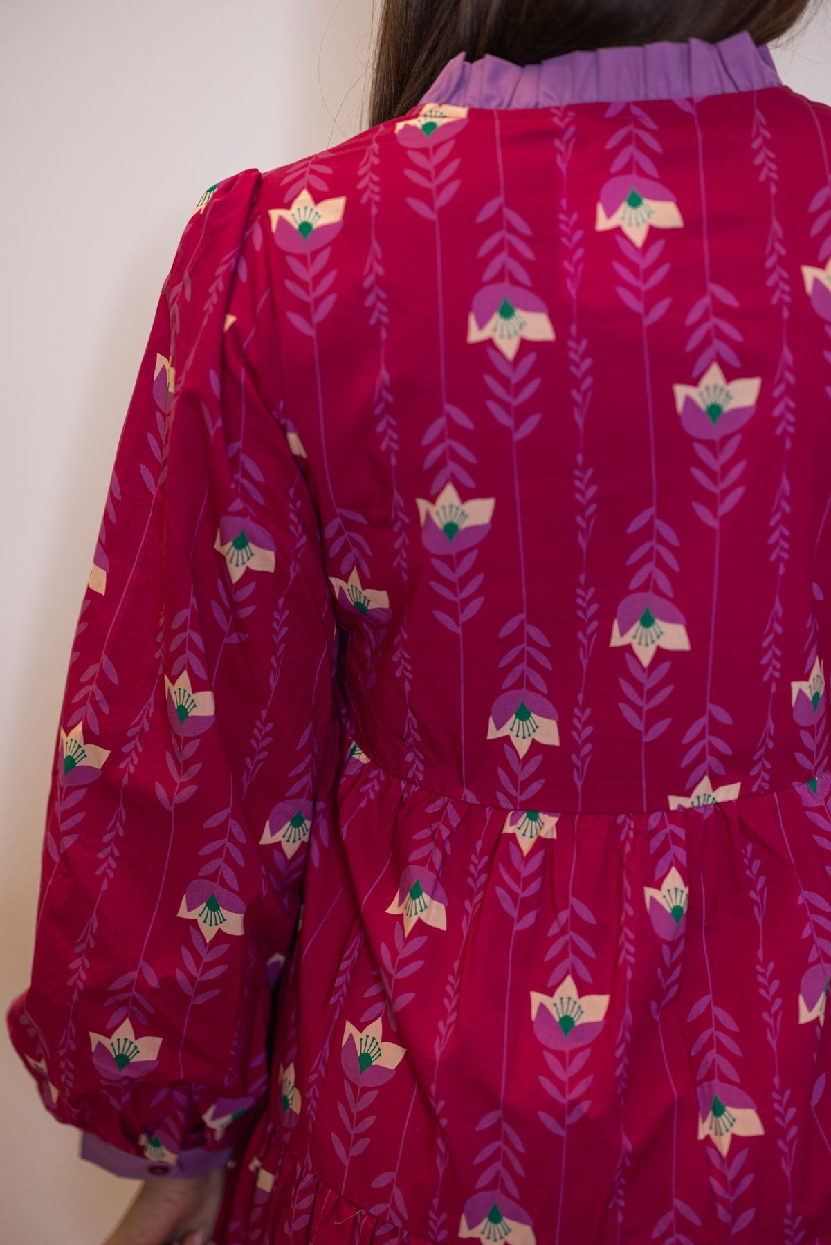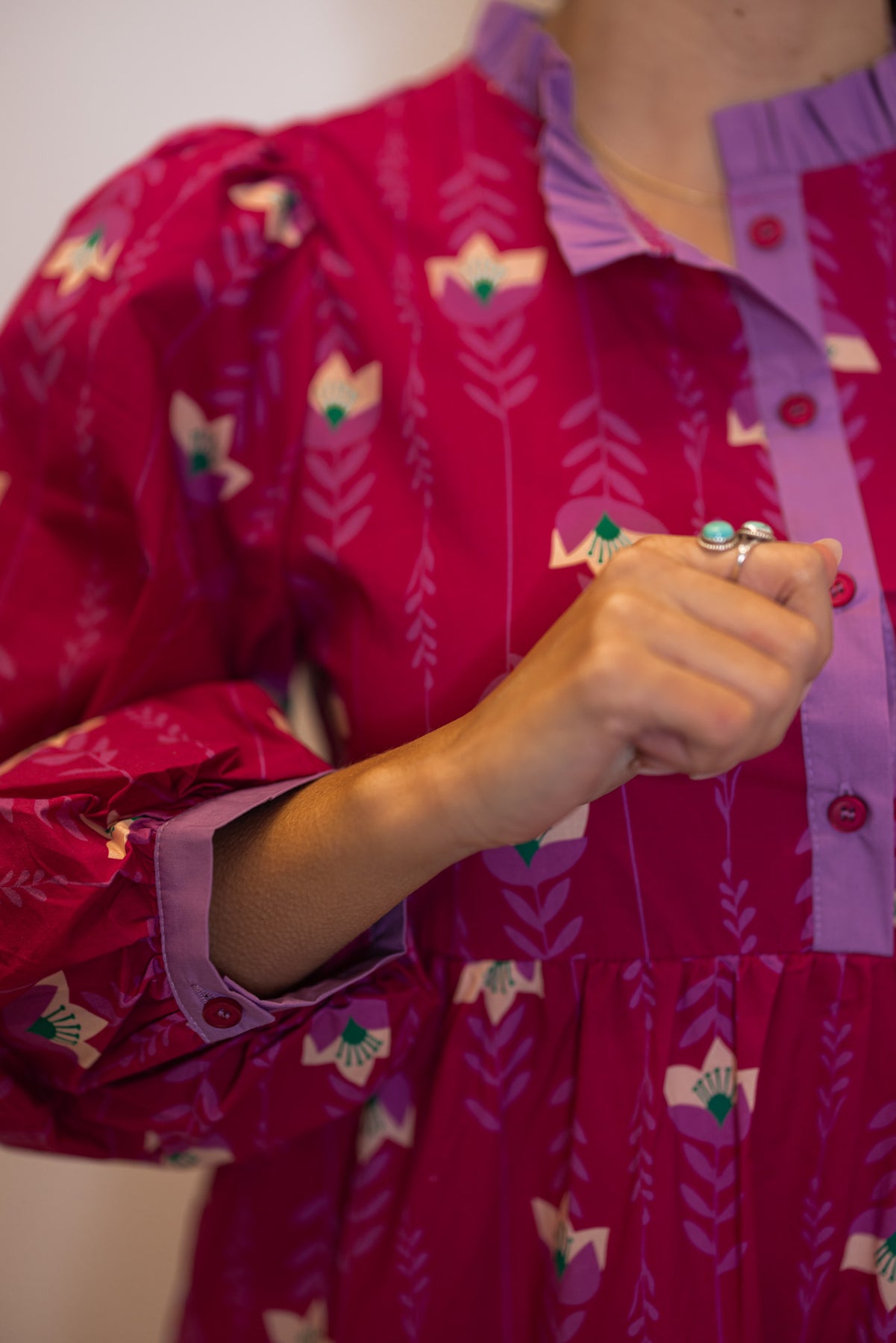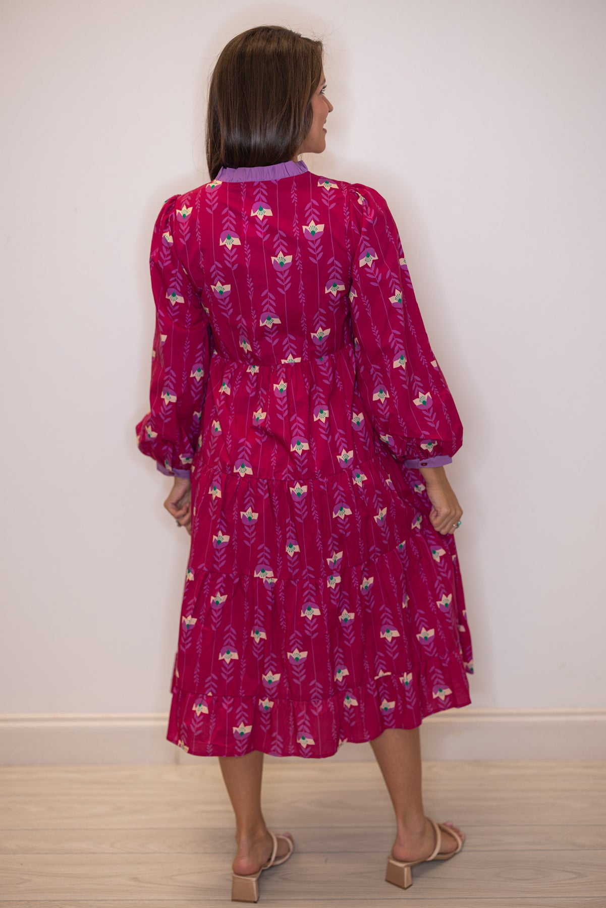 Make a bold statement in the Happy Florals Magenta Midi Dress, featuring vibrant magenta pink fabric with a delicate lavender, peach, and green floral print. Accented with soft lavender trim, this dress offers long balloon sleeves and a flowing tiered skirt for a playful yet elegant silhouette. Perfect for daytime events or special occasions, it blends comfort with eye-catching style, ensuring you stand out with effortless charm!