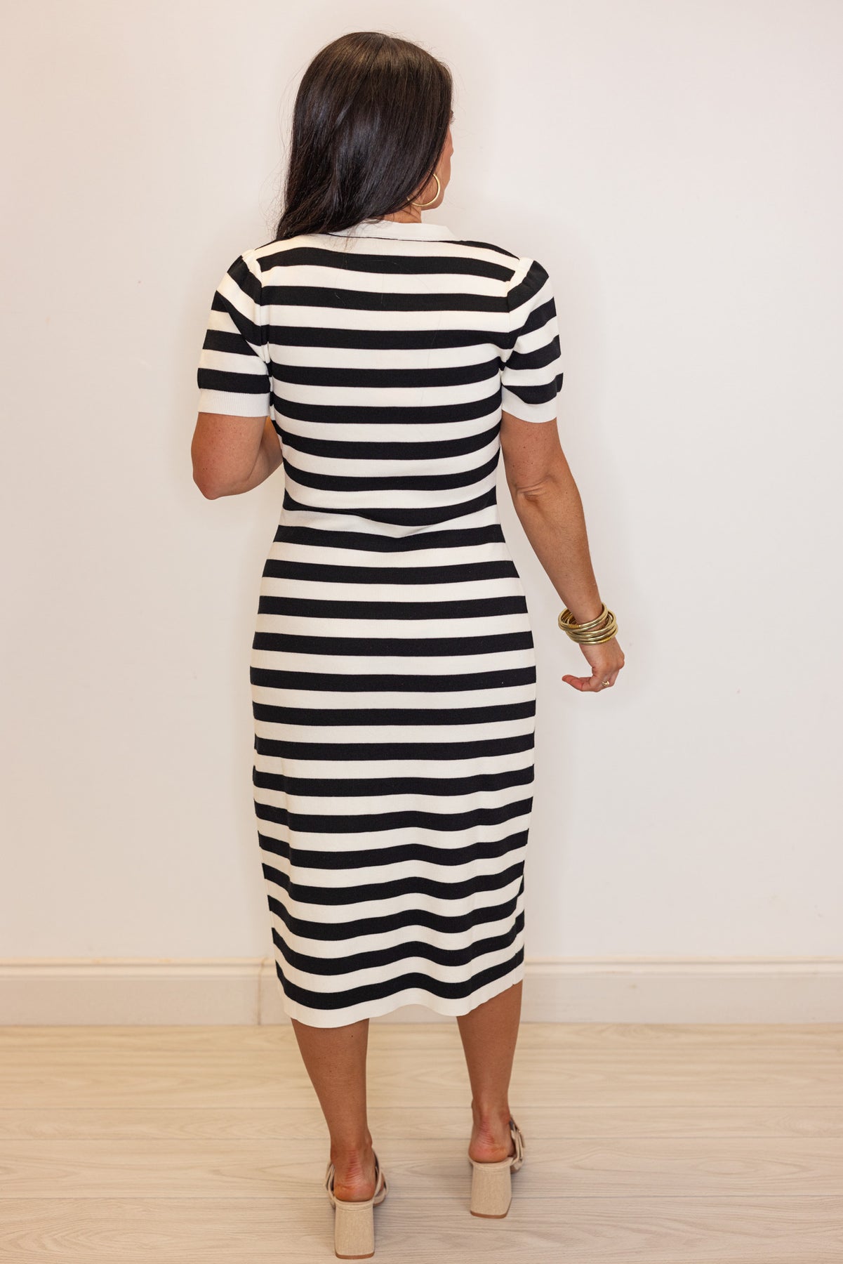 This midi dress is perfect for a seaside stroll! Made of a black and cream striped knit fabric, it features a flattering v neckline and delicate gold button accents down the front. Add a touch of coastal glam to your wardrobe with this lovely striped babe!