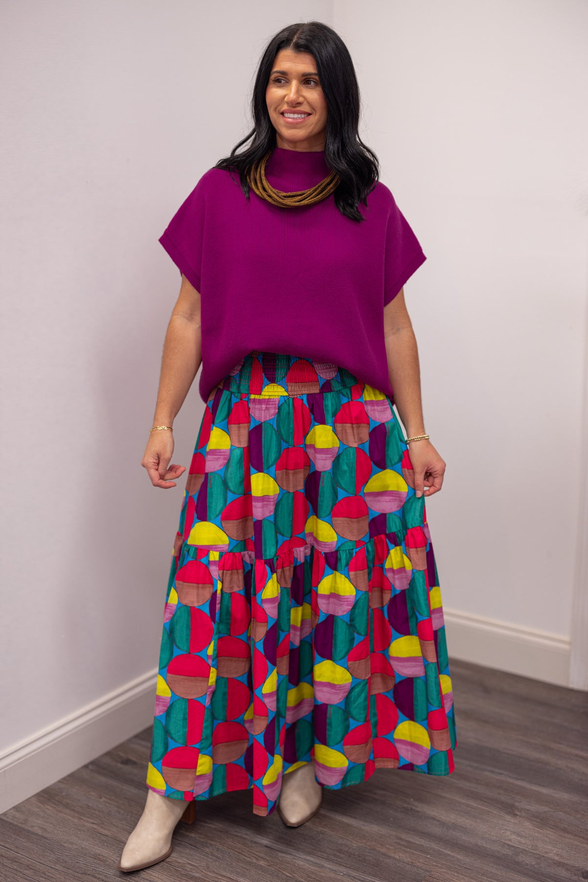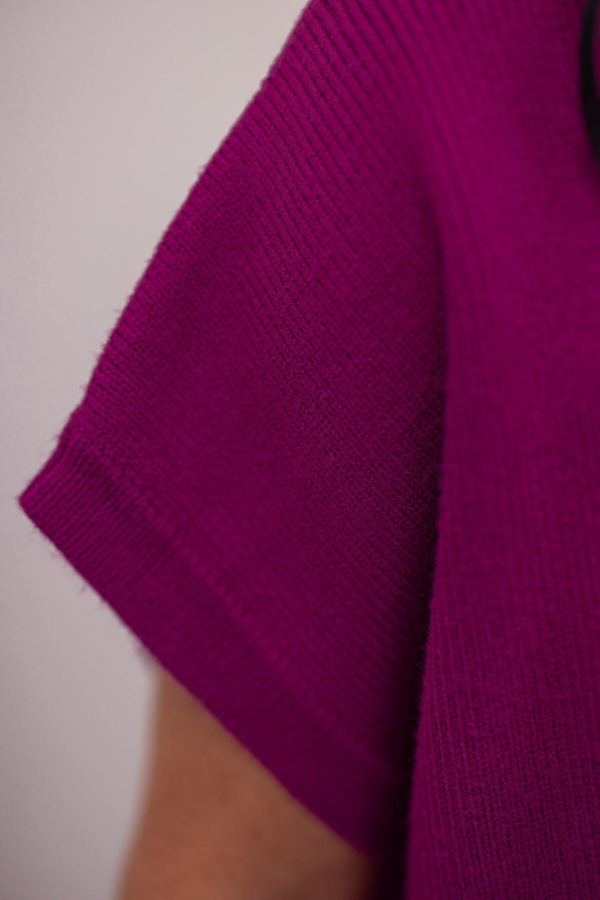 Add a pop of color and cozy vibes with The Everyday Magenta Ribbed Sweater. This playful knit features short sleeves, a fun drop shoulder, and a chic mock neck. The side slit detail adds a flirty twist, making it perfect for layering or wearing solo on breezy days. Brighten your wardrobe with this comfy, stylish essential! Shop the look: Printed Maxi Skirt