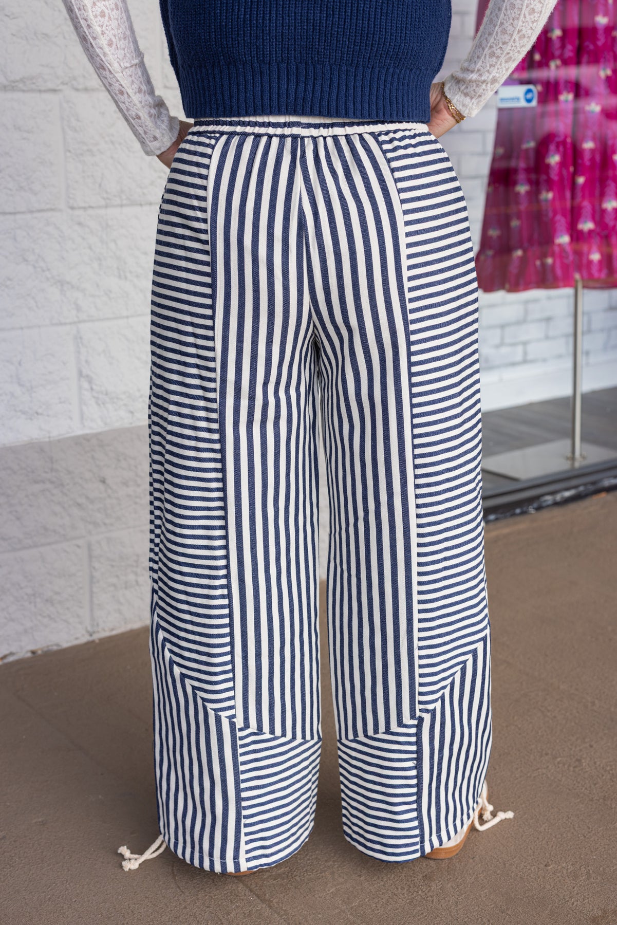 The jogger trend but make it extra CUTE! Check out these wide leg joggers, featuring navy blue and cream multi patterned stripes. With an elastic waistband and drawstring, front pockets, and adjustable cinch ankles you'll be ready to stand out in style. Dress theses babes up or wear them casually - perfect either way! Shop the look: Nautical Navy Knit Top