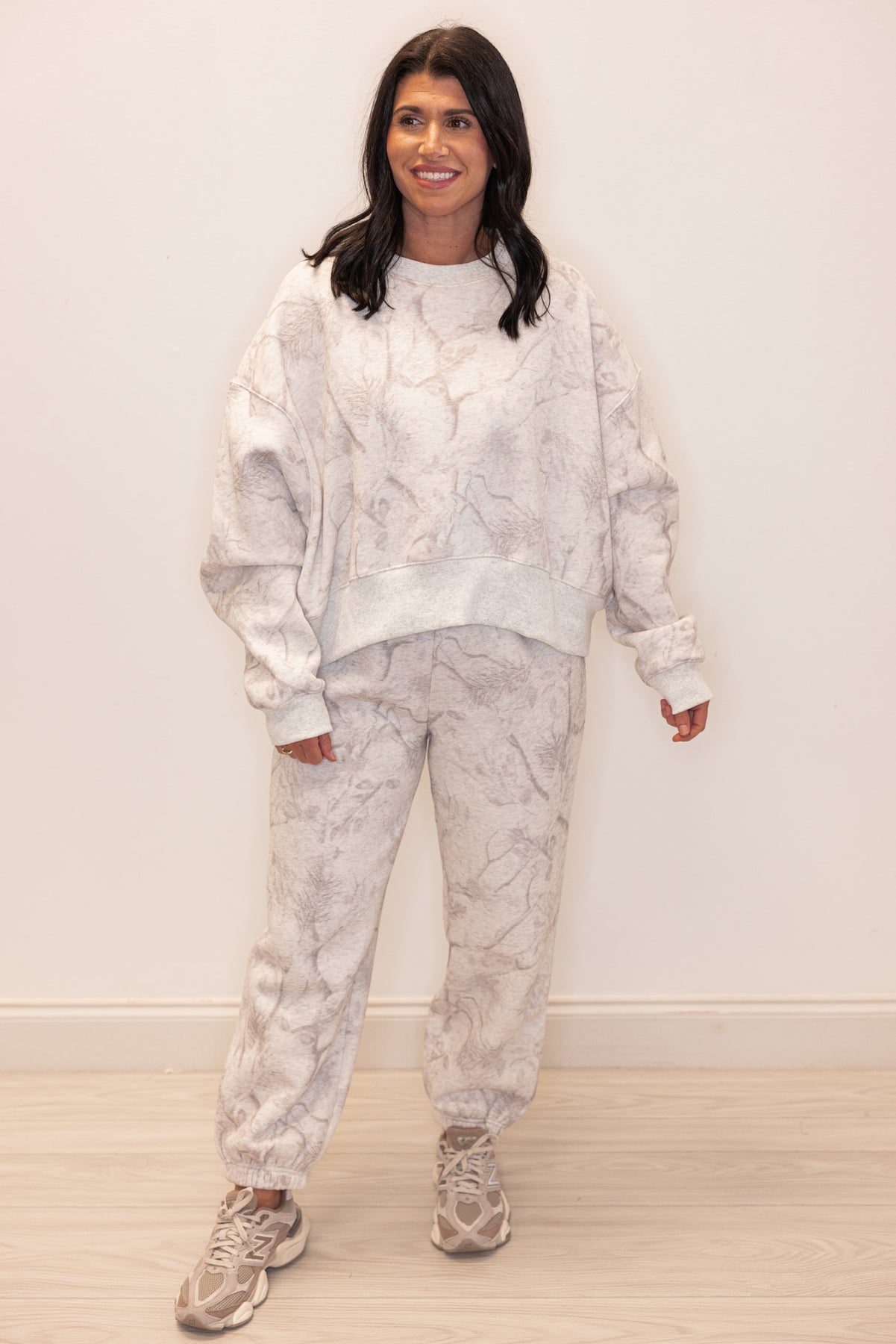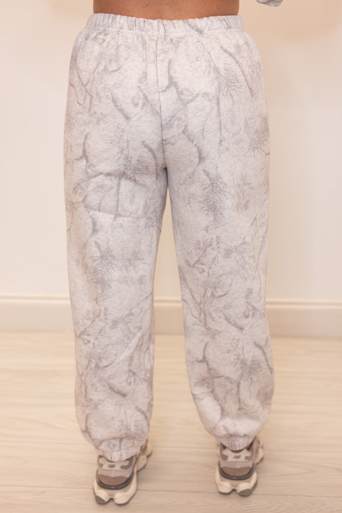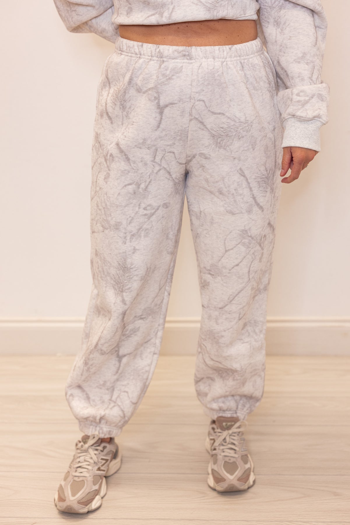 Rock a laid-back vibe with these heather grey camo print fleece jogger pants that's equal parts cozy and cool! The elastic waistband and wide leg silhouette create an effortlessly chic look, while the elastic cuffed ankles add a fun, fashion-forward twist. Soft and comfortable for everyday wear, it's the perfect piece to style with our matching camo sweatshirt for a coordinated set that will turn heads!