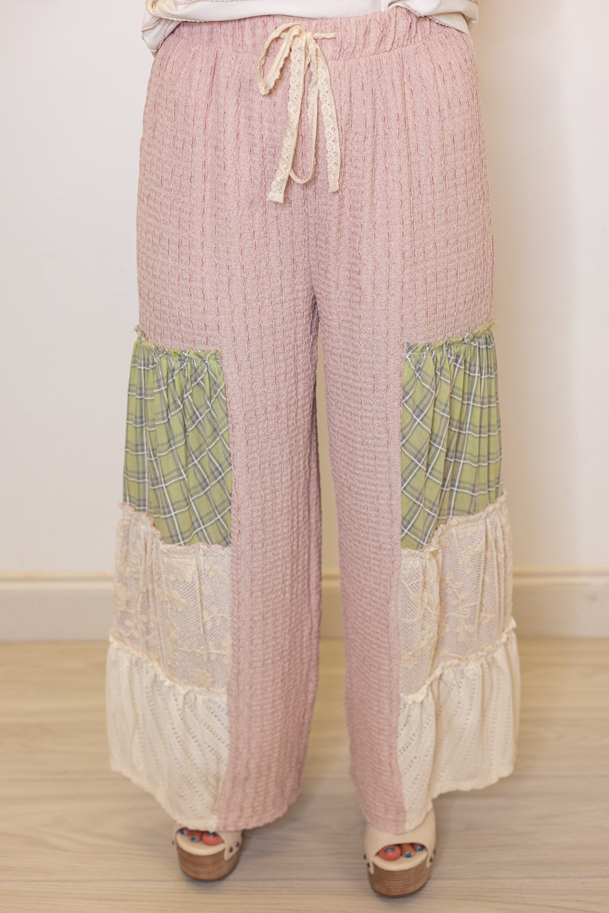 Step into playful comfort with these Colorblock Charm Pink Textured Pants! Featuring dusty pink textured fabric and eye-catching ruffle tiered colorblock patches of plaid, and lace patterns, along each leg. The wide leg cut offers a breezy, relaxed fit, while the elastic waistband ensures all-day comfort, making these adorable pants perfect all season long! Shop the look: Striped Top