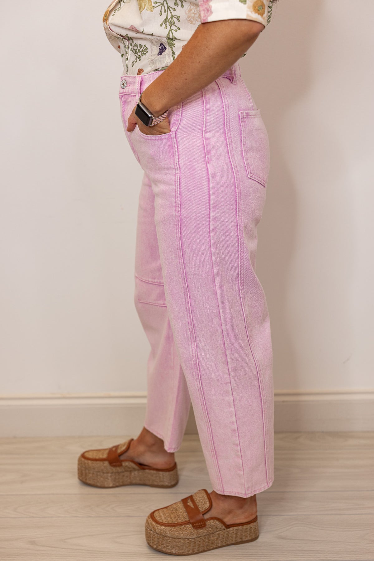 Elevate your denim collection with our Pink Barrel Jeans. These high waisted, ankle length pants feature a classic button and zipper closure for a timeless look. Perfect for any occasion, these versatile jeans offer both style and comfort.