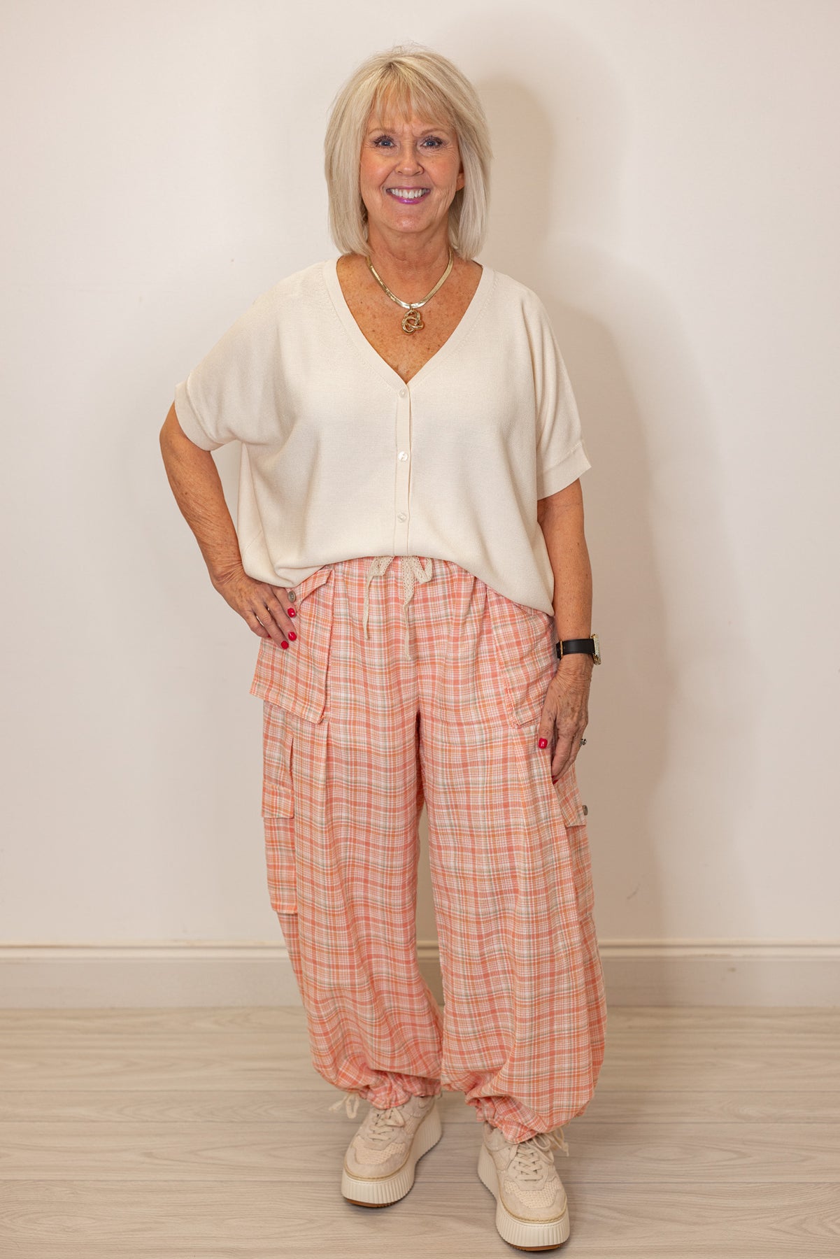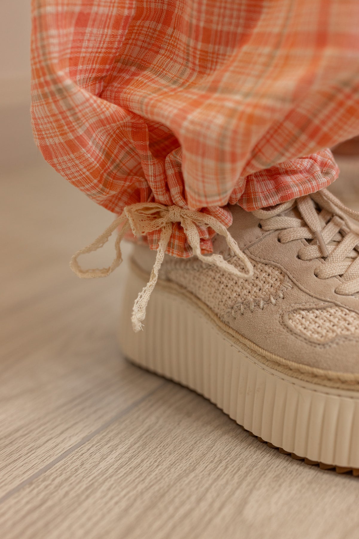 Get ready for a stylish, breezy summer with our Plaid Peach Jogger Balloon Pants. Lightweight and perfect for cooler beach nights, these pants feature a lace drawstring & self adjustable lace tie at hem to make as loose/tight as you desire. Pretty in plaid, you'll love the playful look and comfortable fit. Shop the look: Cardigan Top | Sneakers