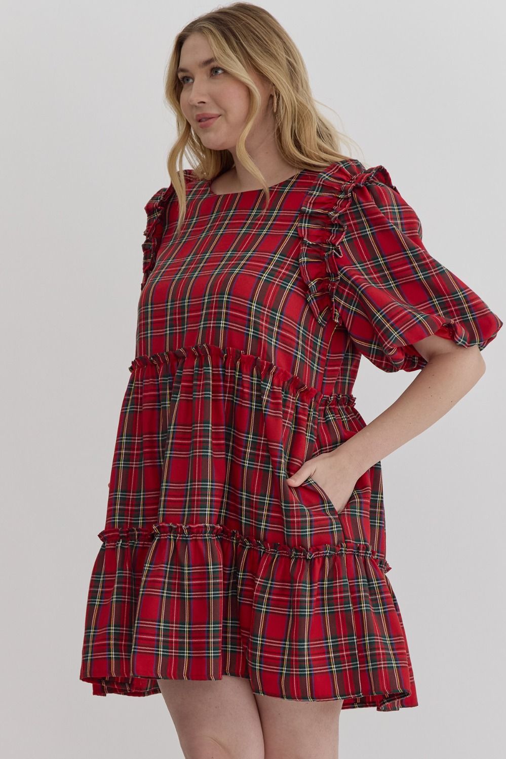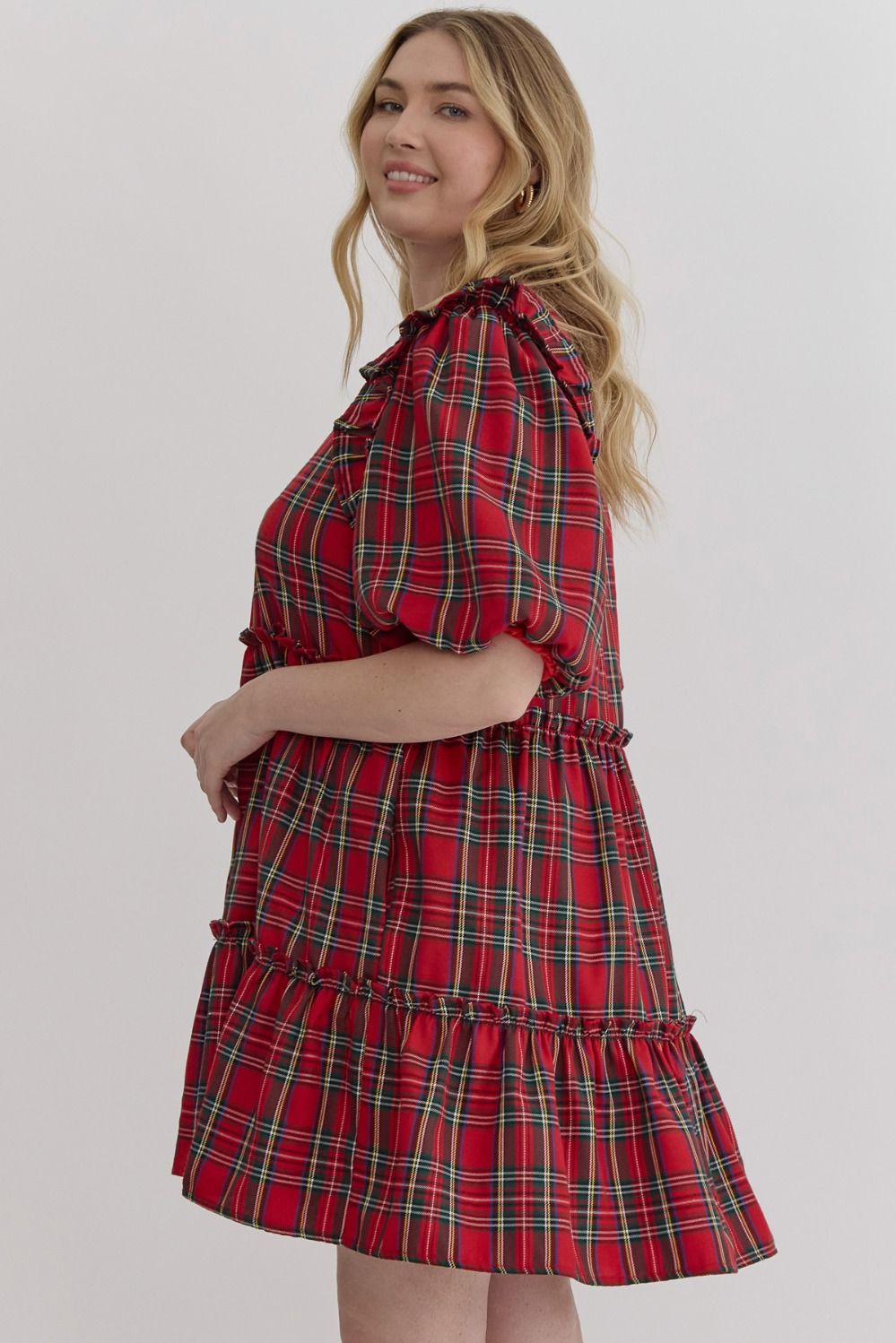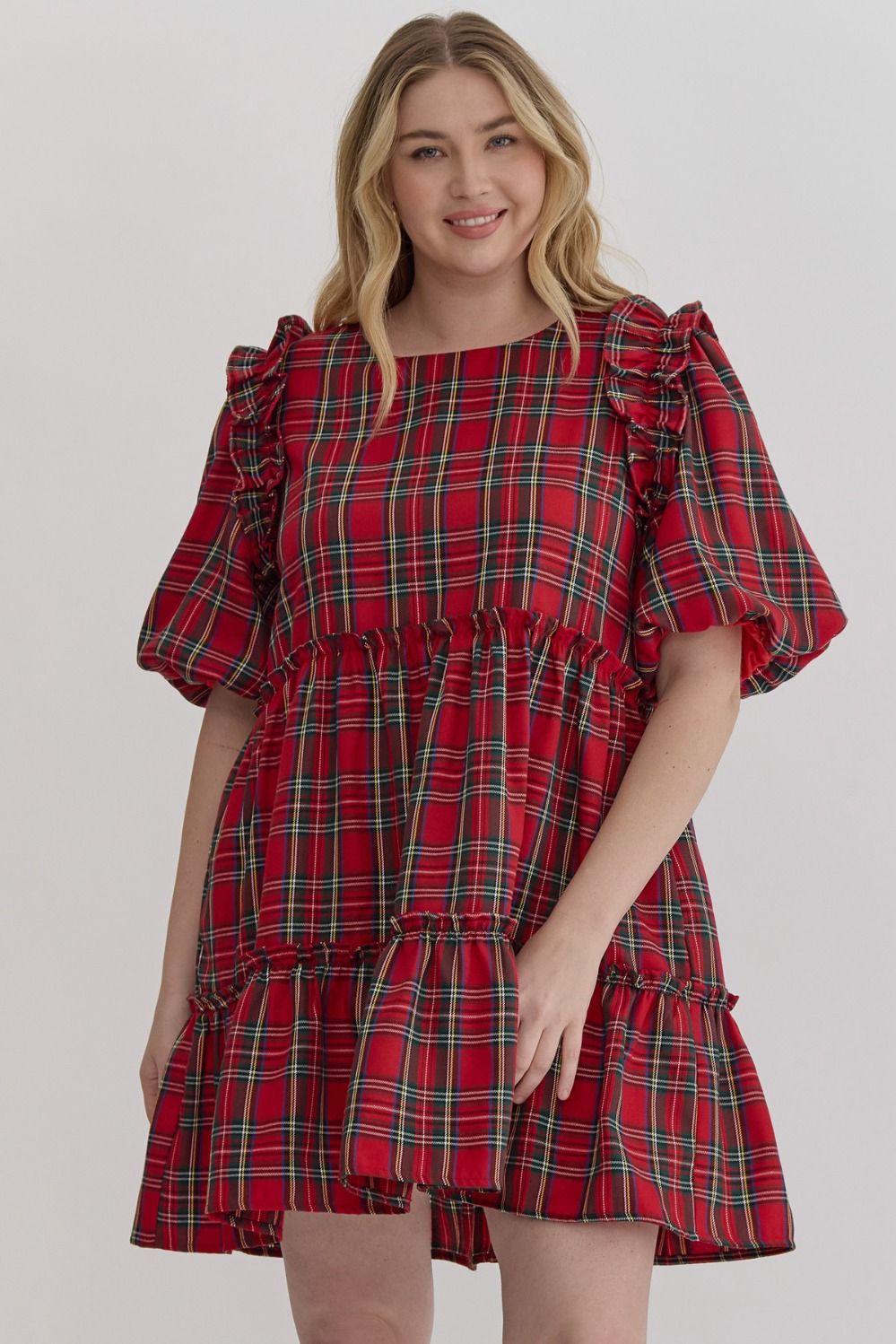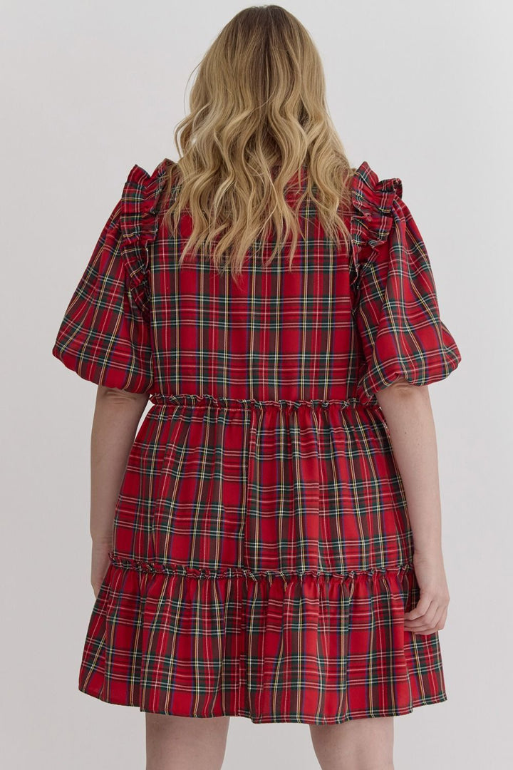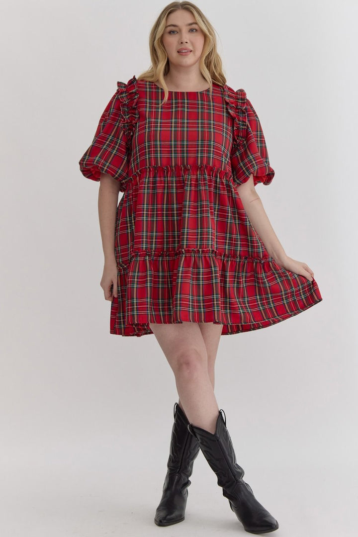 Celebrate the magic of the season in our Holiday Magic red plaid dress! This playful dress features a festive red and green plaid pattern, a flattering crew neckline, and short puff sleeves for a touch of whimsy. The ruffle tiered skirt adds fun movement to your look. Perfect for all of your Holiday parties and gatherings!