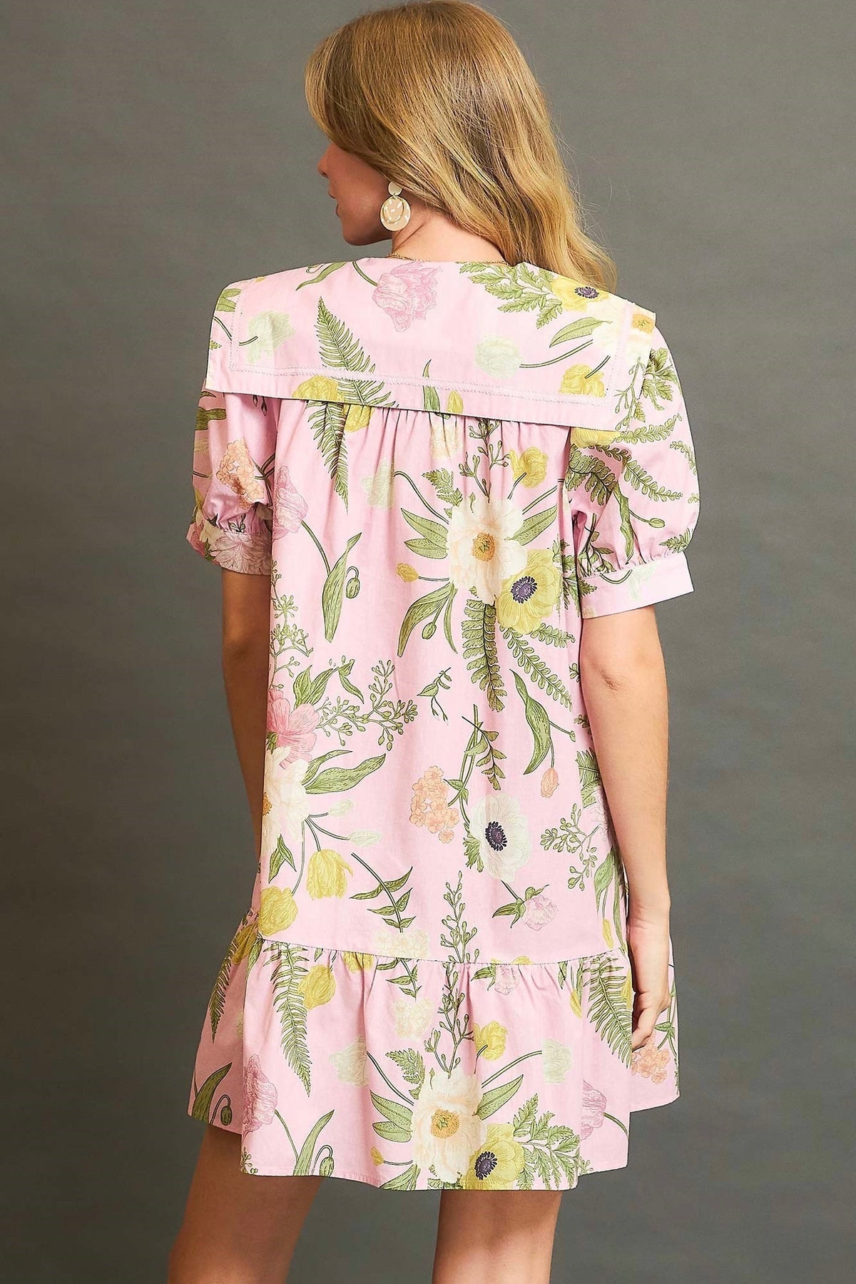 Umgee light pink button front dress with green, yellow, and cream floral print