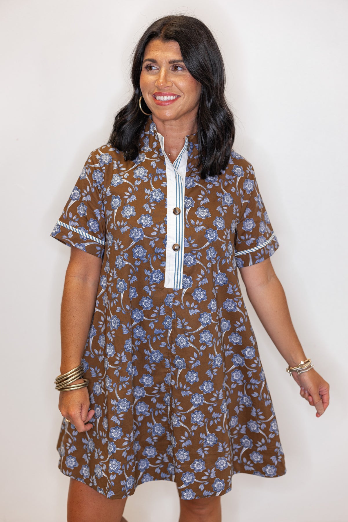 Women's brown dress with blue floral print and striped trim by Entro showing relaxed silouhette