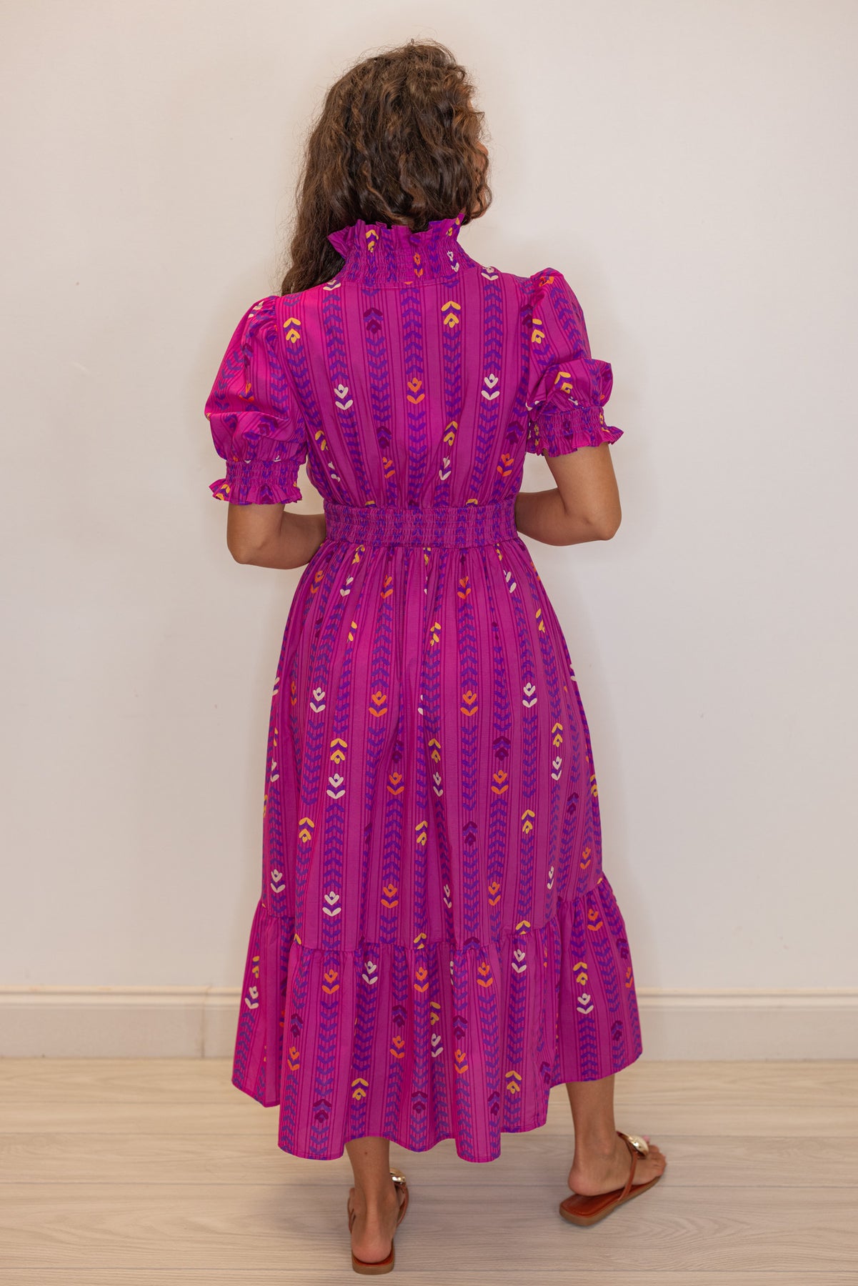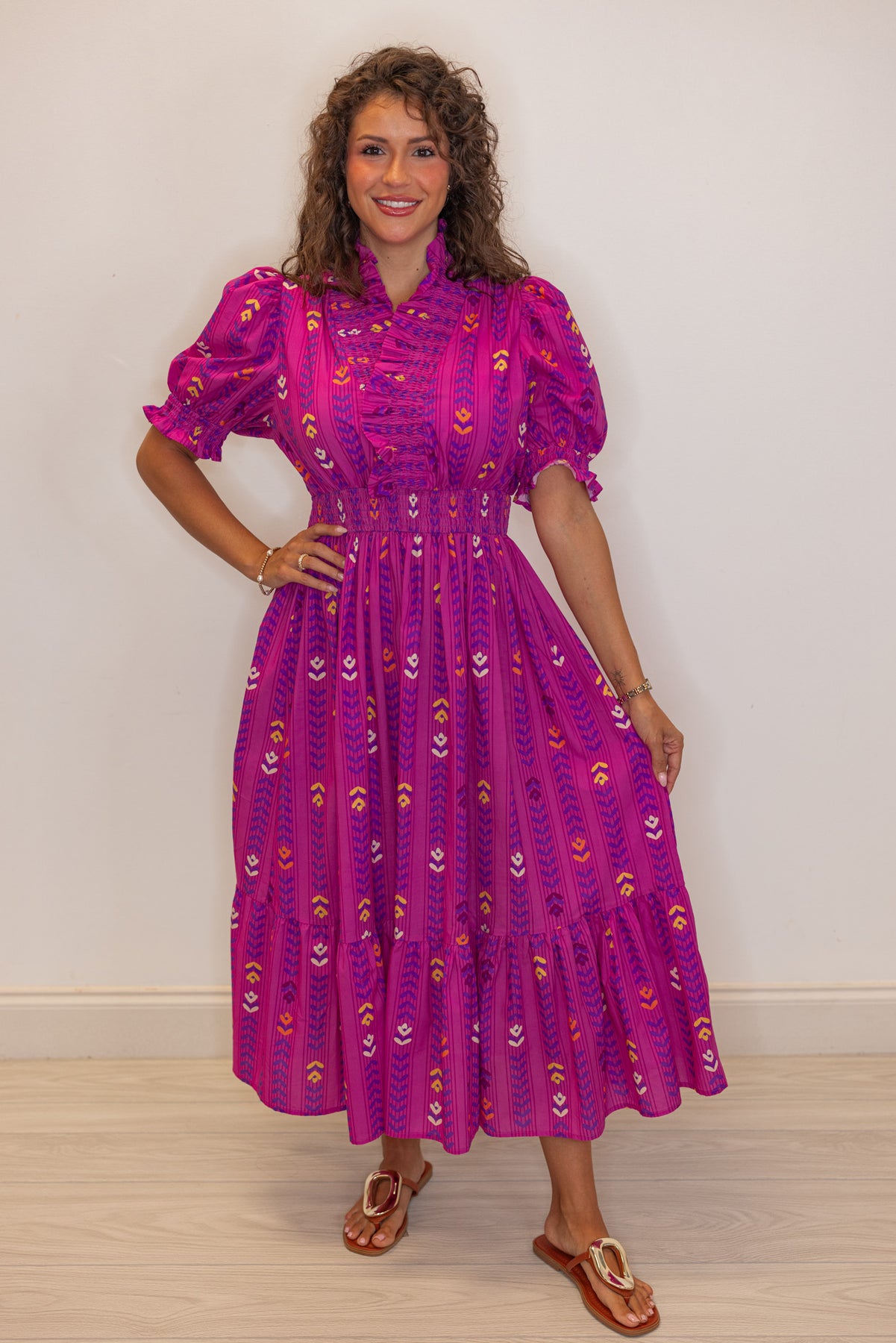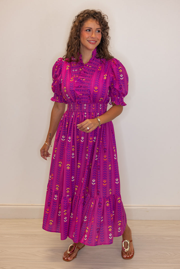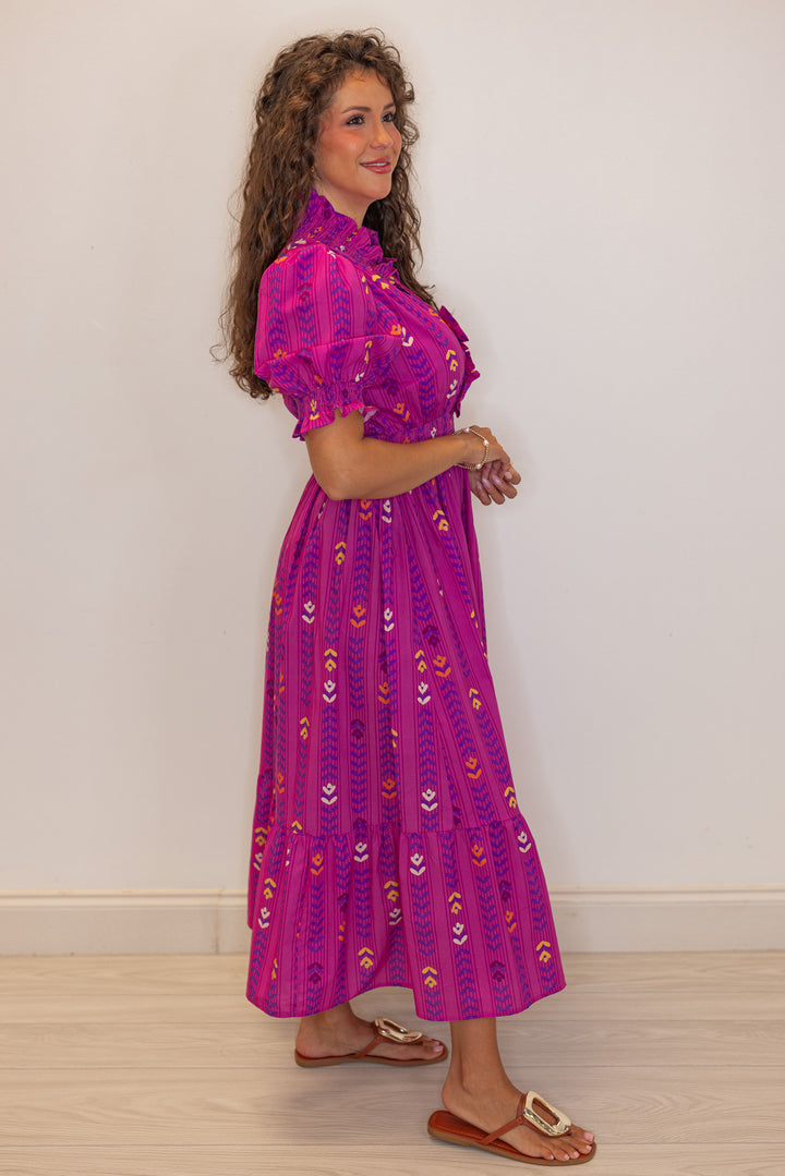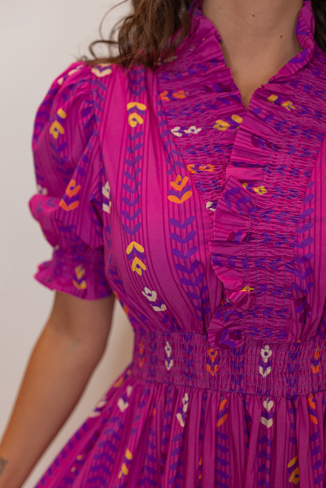Summer calls for pretty petals! Check out this lovely midi dress in magenta and purple petal print - with multicolor petals mixed in - featuring a ruffle trimmed neckline and bodice, and a flattering smocked waistline. The perfect flirty addition to your Summer wardrobe!