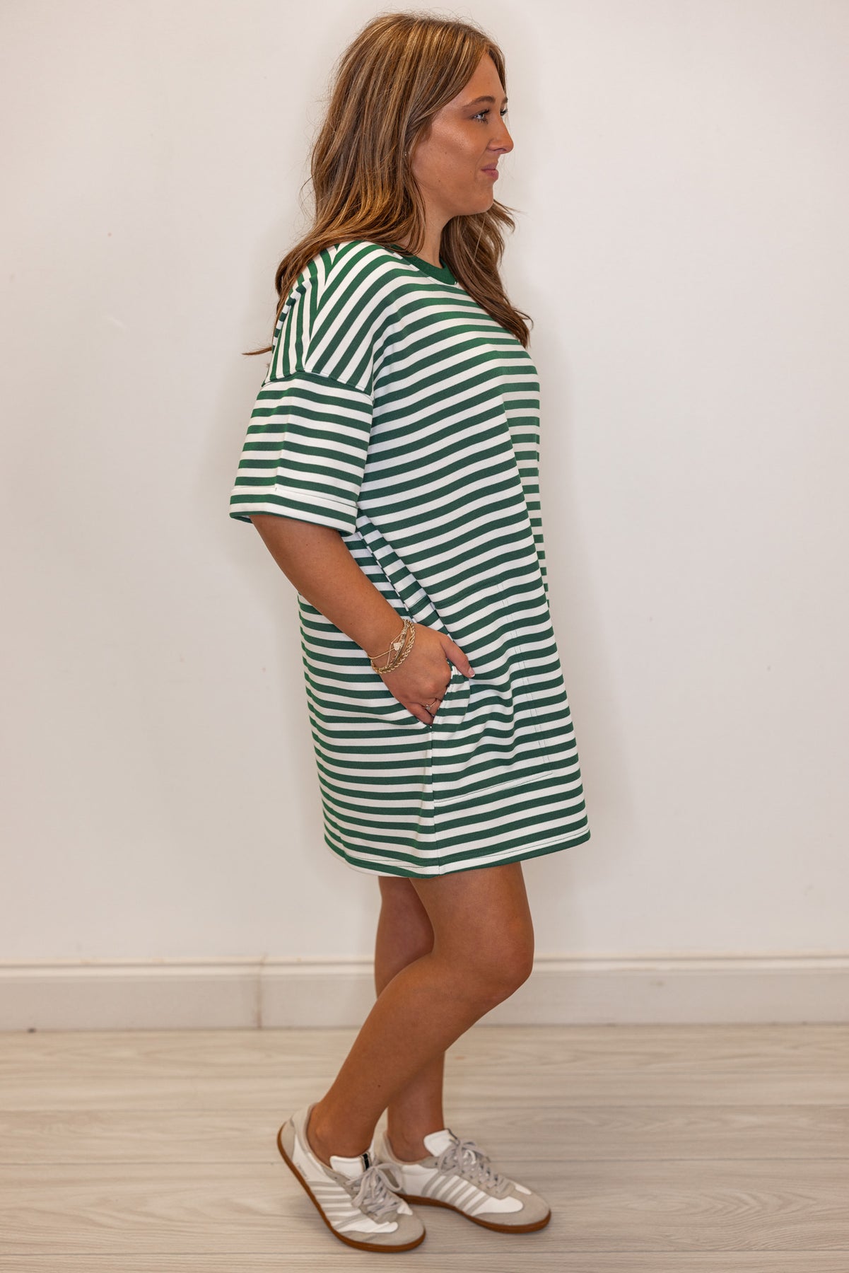 Get ready to delight in stripes with our new Striped Delight Green Knit Dress! This playful babe features green and ivory stripes, a cozy french terry knit fabric - for comfort all day long - and a relaxed fit for easy wear. With a ribbed crew neckline and short sleeves, you'll be looking and feeling fab in this quirky, fun tunic dress!