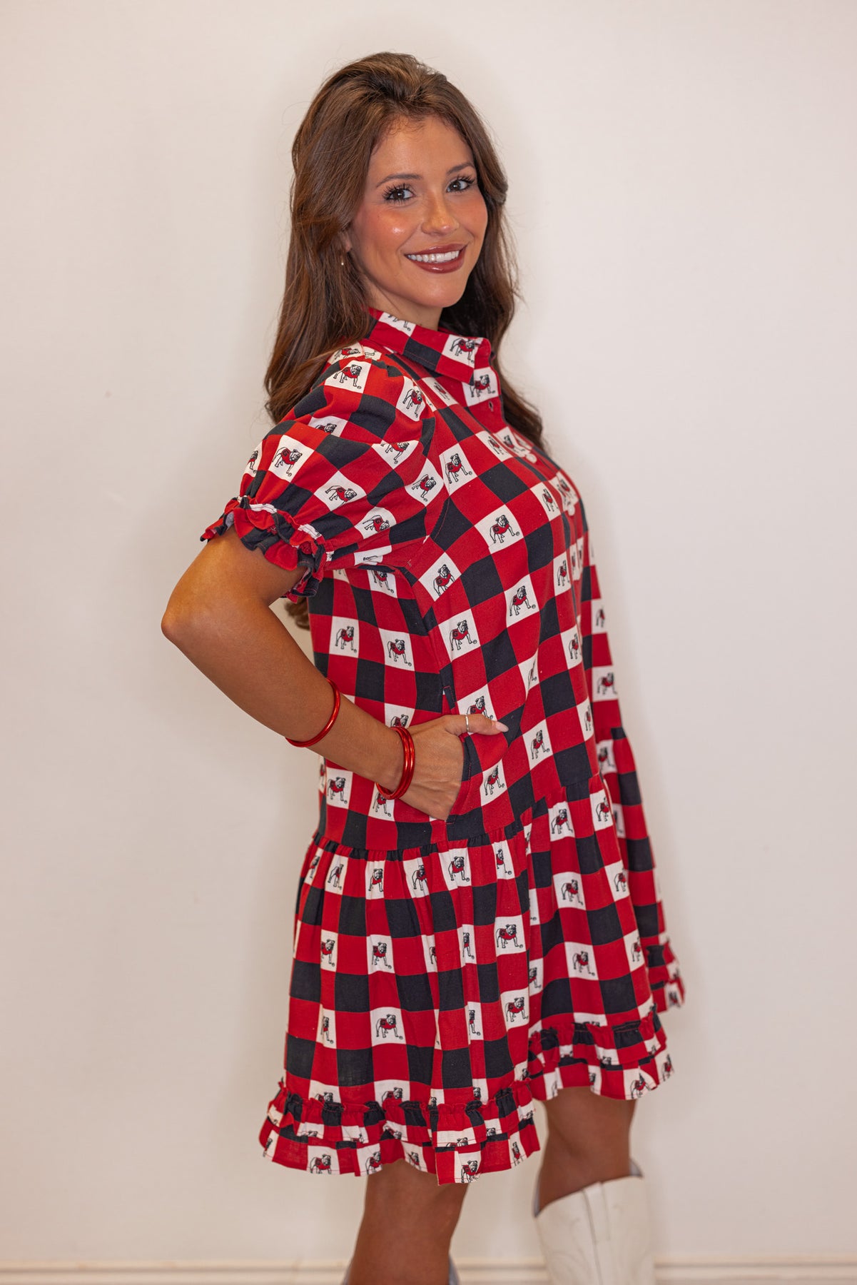 Women's trendy red and black checkered linen dress with UGA bulldog print by Stewart Simmons, perfect for GA gamedays